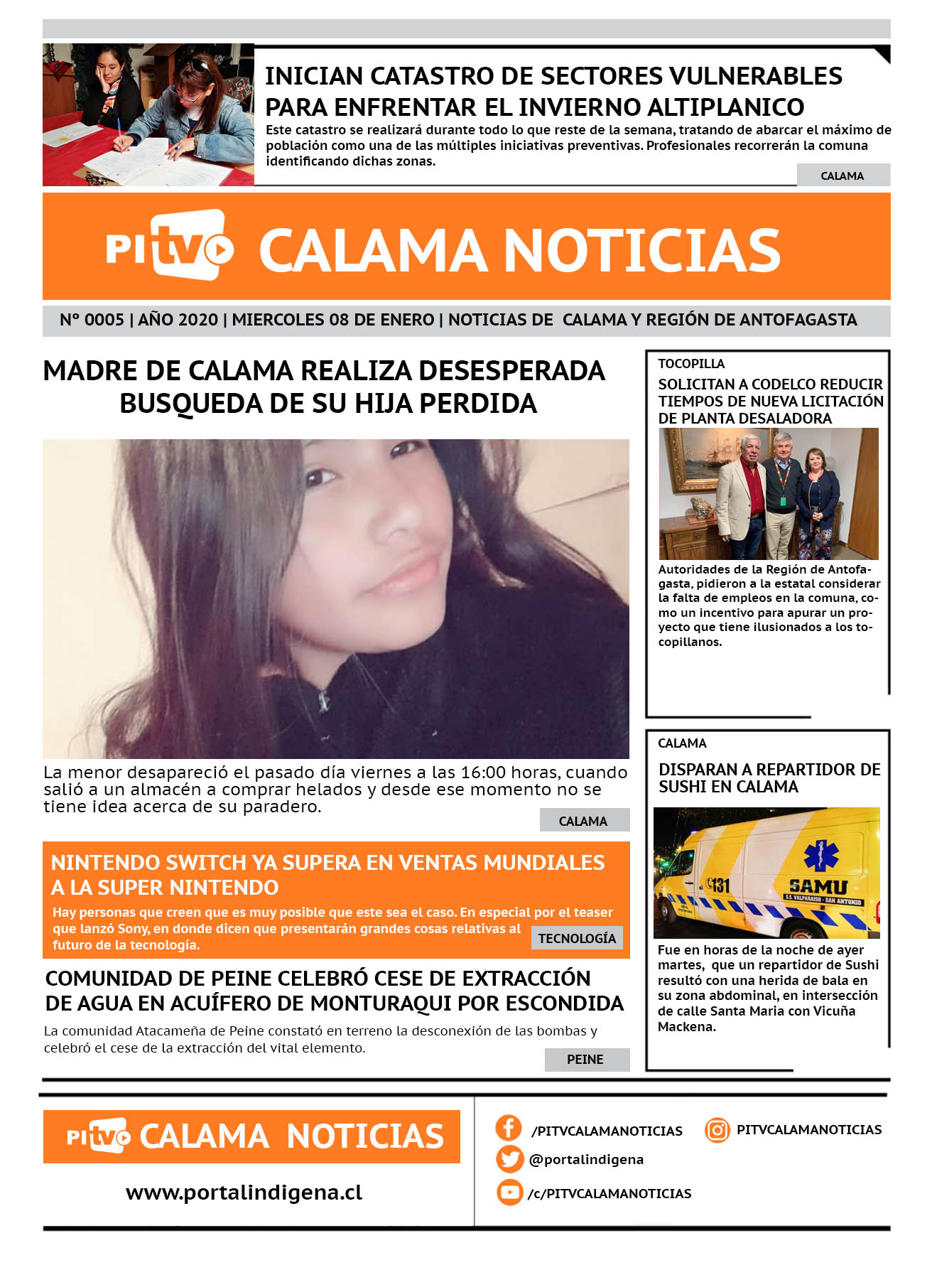 Portada Nº 5 Miercoles 8 de enero de 2020 Por PITV Calama Noticias Miércoles 8 Enero 2020 | 08:00 Share FacebookTwitterWhatsApp VISITAS 245 Lo más leido Contraloría toma razón de Decreto que obliga a empresas de transporte vincular nombres de pasajeros con equipajes para combatir el “Narco Equipaje” 10 de Julio de 2024 Bienes Nacionales notifica desalojo de inmuebles fiscales ubicados en sector Sur de la extensión Puerto Seco en Calama 9 de Octubre de 2024 Doctora venezolana se mantiene internada en estado crítico en Hospital de Calama: Fue encontrada muy mal herida al interior de su departamento 29 de Septiembre de 2025 Autorizan adelantar las vacaciones de invierno para establecimientos educacionales municipales de Calama 13 de Junio de 2024 PITV Calama Noticiashttps://www.pitvcalamanoticias.cl Share FacebookTwitterWhatsApp Previous articleDISPARAN A REPARTIDOR DE SUSHI EN CALAMANext articleINICIAN CATASTRO DE SECTORES VULNERABLES PARA ENFRENTAR EL INVIERNO ALTIPLANICO También puedes leer PDI investiga muerte de hombre en Calama 27 de Abril de 2026 MOP reporta un 30% de avance en obras de Cuesta Montecristo e informa horarios de cortes por tronaduras 27 de Abril de 2026 PDI detiene a boliviano por Violencia Intrafamiliar, desacato y amenazas a funcionario en Calama 27 de Abril de 2026 133 Lo Último PDI investiga muerte de hombre en Calama 27 de Abril de 2026 MOP reporta un 30% de avance en obras de Cuesta Montecristo e informa horarios de cortes por tronaduras 27 de Abril de 2026
