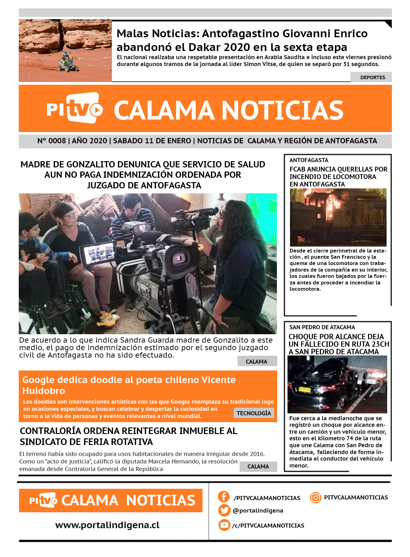 Portada Nº 8 Sabado 11 de enero de 2020 Por PITV Calama Noticias Sábado 11 Enero 2020 | 08:00 Share FacebookTwitterWhatsApp VISITAS 226 Lo más leido Contraloría toma razón de Decreto que obliga a empresas de transporte vincular nombres de pasajeros con equipajes para combatir el “Narco Equipaje” 10 de Julio de 2024 Bienes Nacionales notifica desalojo de inmuebles fiscales ubicados en sector Sur de la extensión Puerto Seco en Calama 9 de Octubre de 2024 Doctora venezolana se mantiene internada en estado crítico en Hospital de Calama: Fue encontrada muy mal herida al interior de su departamento 29 de Septiembre de 2025 Autorizan adelantar las vacaciones de invierno para establecimientos educacionales municipales de Calama 13 de Junio de 2024 PITV Calama Noticiashttps://www.pitvcalamanoticias.cl Share FacebookTwitterWhatsApp Previous articleDETIENEN A SUJETOS QUE ROBABAN ESPECIES DE VEHÍCULOS DE TURISTAS EN VALLE DE LA LUNANext articleCHOQUE POR ALCANCE DEJA UN FALLECIDO EN RUTA CALAMA A SAN PEDRO DE ATACAMA También puedes leer Juanes pondrá el broche de oro en Show Aniversario 147 de Calama 19 de Marzo de 2026 Hospital de Calama habilitó punto transitorio de vacunación contra la Influenza 2026 19 de Marzo de 2026 1 fallecido tras volcamiento en camino a Socaire (ruta 23ch) 19 de Marzo de 2026 224 Lo Último Juanes pondrá el broche de oro en Show Aniversario 147 de Calama 19 de Marzo de 2026 Hospital de Calama habilitó punto transitorio de vacunación contra la Influenza 2026 19 de Marzo de 2026