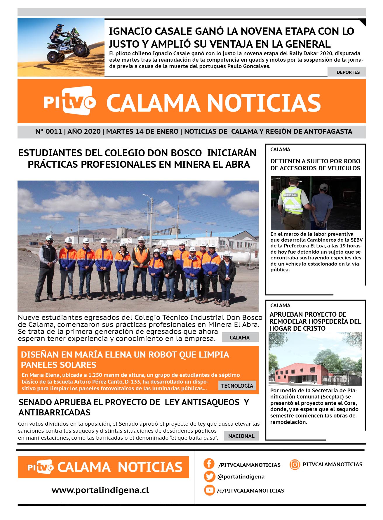Portada Nº 11 Martes 14 de enero de 2020 Por PITV Calama Noticias Martes 14 Enero 2020 | 10:30 Share FacebookTwitterWhatsApp VISITAS 225 Lo más leido Contraloría toma razón de Decreto que obliga a empresas de transporte vincular nombres de pasajeros con equipajes para combatir el “Narco Equipaje” 10 de Julio de 2024 Bienes Nacionales notifica desalojo de inmuebles fiscales ubicados en sector Sur de la extensión Puerto Seco en Calama 9 de Octubre de 2024 Doctora venezolana se mantiene internada en estado crítico en Hospital de Calama: Fue encontrada muy mal herida al interior de su departamento 29 de Septiembre de 2025 Autorizan adelantar las vacaciones de invierno para establecimientos educacionales municipales de Calama 13 de Junio de 2024 PITV Calama Noticiashttps://www.pitvcalamanoticias.cl Share FacebookTwitterWhatsApp Previous articleCODELCO SE QUERELLA CONTRA QUIENES RESULTEN RESPONSABLES POR ESTAFA EN LA ADMINISTRACION DE SEGUROS DE VIDANext articleESTUDIANTES DEL COLEGIO DON BOSCO DE CALAMA INICIARÁN PRÁCTICAS PROFESIONALES EN MINERA EL ABRA También puedes leer 1 fallecido tras volcamiento en camino a Socaire (ruta 23ch) 19 de Marzo de 2026 Minera El Abra, filial de Freeport-McMoRan ingresa Proyecto de Continuidad Operacional para evaluación ambiental 19 de Marzo de 2026 PDI esclarece hallazgo de dedo humano en Calama y descarta delito 18 de Marzo de 2026 111 Lo Último 1 fallecido tras volcamiento en camino a Socaire (ruta 23ch) 19 de Marzo de 2026 Minera El Abra, filial de Freeport-McMoRan ingresa Proyecto de Continuidad Operacional para evaluación ambiental 19 de Marzo de 2026