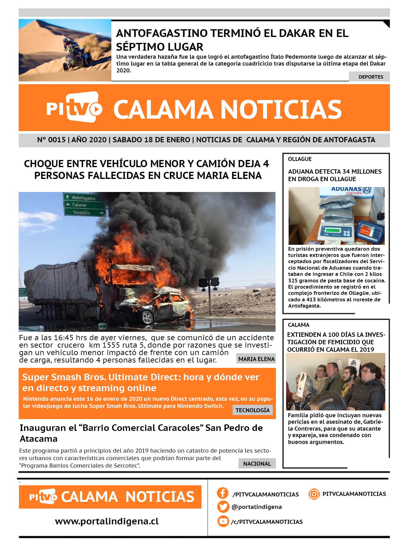 Portada Nº 15 Sabado 18 de enero de 2020 Por PITV Calama Noticias Sábado 18 Enero 2020 | 08:00 Share FacebookTwitterWhatsApp VISITAS 133 Lo más leido Contraloría toma razón de Decreto que obliga a empresas de transporte vincular nombres de pasajeros con equipajes para combatir el “Narco Equipaje” 10 de Julio de 2024 Bienes Nacionales notifica desalojo de inmuebles fiscales ubicados en sector Sur de la extensión Puerto Seco en Calama 9 de Octubre de 2024 Doctora venezolana se mantiene internada en estado crítico en Hospital de Calama: Fue encontrada muy mal herida al interior de su departamento 29 de Septiembre de 2025 Autorizan adelantar las vacaciones de invierno para establecimientos educacionales municipales de Calama 13 de Junio de 2024 PITV Calama Noticiashttps://www.pitvcalamanoticias.cl Share FacebookTwitterWhatsApp Previous articleCHOQUE ENTRE VEHÍCULO MENOR Y CAMIÓN DEJA 4 PERSONAS FALLECIDAS EN CRUCE MARIA ELENANext articleEXTIENDEN A 100 DÍAS LA INVESTIGACIÓN DE FEMICIDIO QUE OCURRIÓ EN CALAMA EL 2019 También puedes leer Cerco al narcotráfico permite incautación de 1.348 kilos de drogas en dos procedimientos 18 de Marzo de 2026 Investigan muerte de menor de 5 años en Antofagasta: hay una detenida 17 de Marzo de 2026 PDI despliega fiscalización migratoria masiva en Antofagasta y concreta detenciones por infracciones y expulsión vigente 17 de Marzo de 2026 125 Lo Último Cerco al narcotráfico permite incautación de 1.348 kilos de drogas en dos procedimientos 18 de Marzo de 2026 Investigan muerte de menor de 5 años en Antofagasta: hay una detenida 17 de Marzo de 2026