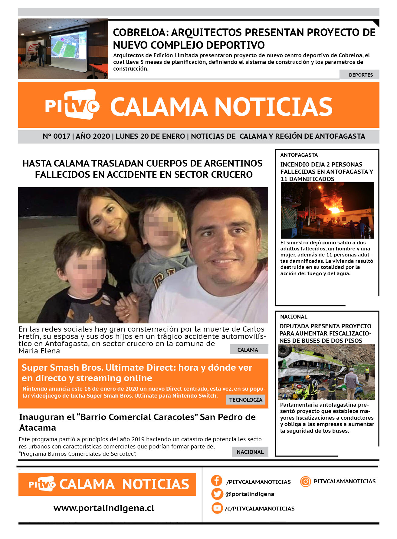 Portada Nº 17 Lunes 20 de enero de 2020 Por PITV Calama Noticias Lunes 20 Enero 2020 | 10:00 Share FacebookTwitterWhatsApp VISITAS 193 Lo más leido Contraloría toma razón de Decreto que obliga a empresas de transporte vincular nombres de pasajeros con equipajes para combatir el “Narco Equipaje” 10 de Julio de 2024 Bienes Nacionales notifica desalojo de inmuebles fiscales ubicados en sector Sur de la extensión Puerto Seco en Calama 9 de Octubre de 2024 Doctora venezolana se mantiene internada en estado crítico en Hospital de Calama: Fue encontrada muy mal herida al interior de su departamento 29 de Septiembre de 2025 Autorizan adelantar las vacaciones de invierno para establecimientos educacionales municipales de Calama 13 de Junio de 2024 PITV Calama Noticiashttps://www.pitvcalamanoticias.cl Share FacebookTwitterWhatsApp Previous articleINCENDIO DEJA 2 PERSONAS FALLECIDAS EN ANTOFAGASTA Y 11 DAMNIFICADOSNext articleDIPUTADA PRESENTA PROYECTO PARA AUMENTAR FISCALIZACIONES DE BUSES DE DOS PISOS También puedes leer Investigan muerte de menor de 5 años en Antofagasta: hay una detenida 17 de Marzo de 2026 PDI despliega fiscalización migratoria masiva en Antofagasta y concreta detenciones por infracciones y expulsión vigente 17 de Marzo de 2026 Carabineros detiene a tres sujetos por tráfico de drogas en Calama 17 de Marzo de 2026 126 Lo Último Investigan muerte de menor de 5 años en Antofagasta: hay una detenida 17 de Marzo de 2026 PDI despliega fiscalización migratoria masiva en Antofagasta y concreta detenciones por infracciones y expulsión vigente 17 de Marzo de 2026