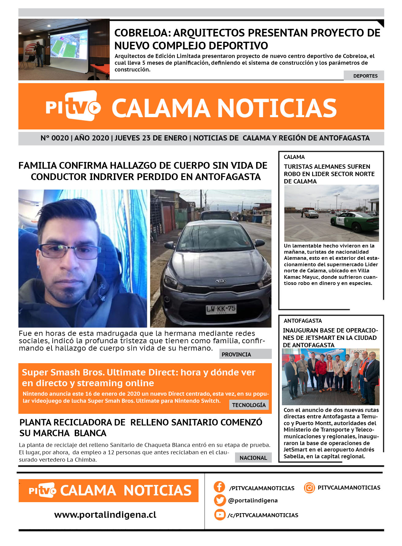 Portada Nº 20 Jueves 23 de enero de 2020 Por PITV Calama Noticias Jueves 23 Enero 2020 | 18:21 Share FacebookTwitterWhatsApp VISITAS 1,672 Lo más leido Contraloría toma razón de Decreto que obliga a empresas de transporte vincular nombres de pasajeros con equipajes para combatir el “Narco Equipaje” 10 de Julio de 2024 Bienes Nacionales notifica desalojo de inmuebles fiscales ubicados en sector Sur de la extensión Puerto Seco en Calama 9 de Octubre de 2024 Doctora venezolana se mantiene internada en estado crítico en Hospital de Calama: Fue encontrada muy mal herida al interior de su departamento 29 de Septiembre de 2025 Autorizan adelantar las vacaciones de invierno para establecimientos educacionales municipales de Calama 13 de Junio de 2024 PITV Calama Noticiashttps://www.pitvcalamanoticias.cl Share FacebookTwitterWhatsApp Previous articleINTENSA NEBLINA OBLIGÓ A SUSPENSIÓN DE VUELOS EN CALAMANext articleALUVIÓN EN TURI PROVOCA SERIOS DAÑOS EN VIVIENDAS , ANIMALES Y AGRICULTURA También puedes leer Investigan muerte de menor de 5 años en Antofagasta: hay una detenida 17 de Marzo de 2026 PDI despliega fiscalización migratoria masiva en Antofagasta y concreta detenciones por infracciones y expulsión vigente 17 de Marzo de 2026 Carabineros detiene a tres sujetos por tráfico de drogas en Calama 17 de Marzo de 2026 2892 Lo Último Investigan muerte de menor de 5 años en Antofagasta: hay una detenida 17 de Marzo de 2026 PDI despliega fiscalización migratoria masiva en Antofagasta y concreta detenciones por infracciones y expulsión vigente 17 de Marzo de 2026
