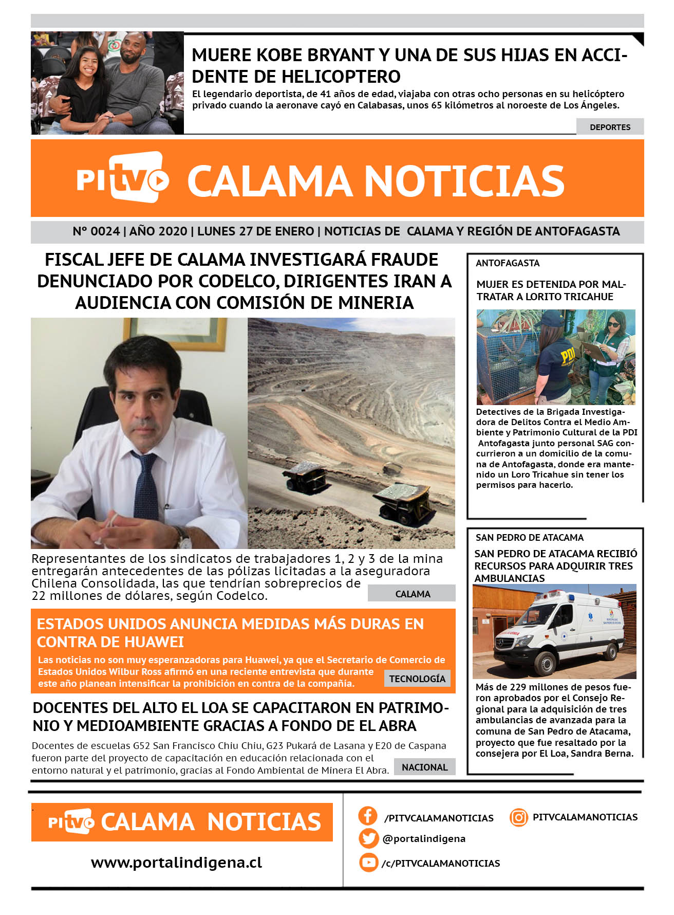 Portada Nº 24 Lunes 27 de enero de 2020 Por PITV Calama Noticias Lunes 27 Enero 2020 | 09:00 Share FacebookTwitterWhatsApp VISITAS 129 Lo más leido Contraloría toma razón de Decreto que obliga a empresas de transporte vincular nombres de pasajeros con equipajes para combatir el “Narco Equipaje” 10 de Julio de 2024 Bienes Nacionales notifica desalojo de inmuebles fiscales ubicados en sector Sur de la extensión Puerto Seco en Calama 9 de Octubre de 2024 Doctora venezolana se mantiene internada en estado crítico en Hospital de Calama: Fue encontrada muy mal herida al interior de su departamento 29 de Septiembre de 2025 Autorizan adelantar las vacaciones de invierno para establecimientos educacionales municipales de Calama 13 de Junio de 2024 PITV Calama Noticiashttps://www.pitvcalamanoticias.cl Share FacebookTwitterWhatsApp Previous articleSAN PEDRO DE ATACAMA RECIBIÓ RECURSOS PARA ADQUIRIR TRES AMBULANCIASNext articleCOBRELOA: ERIC AHUMADA YA ESTÁ EN CALAMA Y SE UNE A PRÁCTICAS CON COMPAÑEROS También puedes leer PDI esclarece hallazgo de dedo humano en Calama y descarta delito 18 de Marzo de 2026 Fiscalización migratoria en Calama deja 10 extranjeros denunciados y una persona detenida 18 de Marzo de 2026 Alcalde Eliecer Chamorro fortalece coordinación con el nuevo Delegado Presidencial de El Loa para avanzar en seguridad y desarrollo comunal 18 de Marzo de 2026 101 Lo Último PDI esclarece hallazgo de dedo humano en Calama y descarta delito 18 de Marzo de 2026 Fiscalización migratoria en Calama deja 10 extranjeros denunciados y una persona detenida 18 de Marzo de 2026
