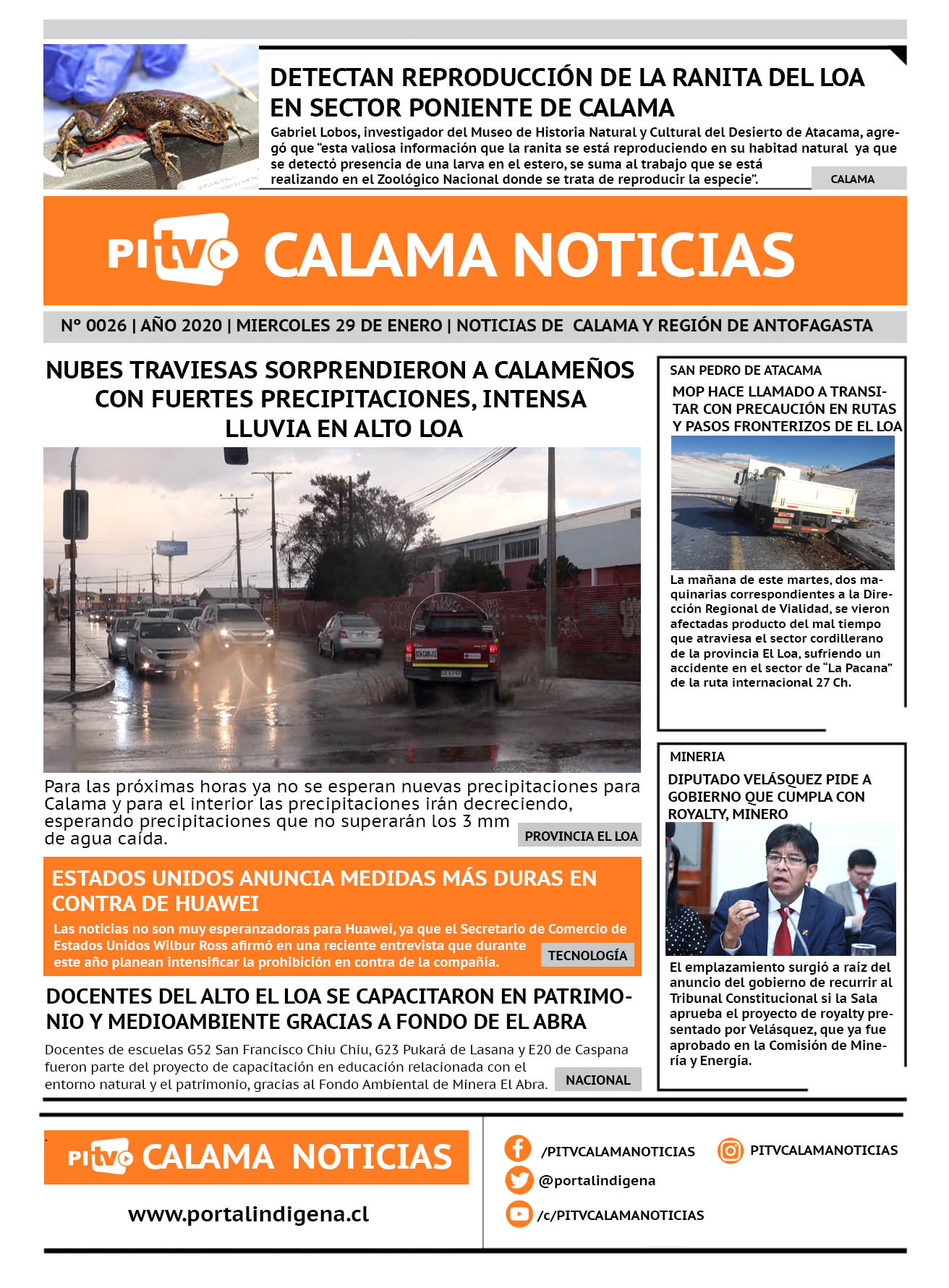 Portada Nº 26 Miércoles 29 de enero de 2020 Por PITV Calama Noticias Miércoles 29 Enero 2020 | 09:00 Share FacebookTwitterWhatsApp VISITAS 110 Lo más leido Contraloría toma razón de Decreto que obliga a empresas de transporte vincular nombres de pasajeros con equipajes para combatir el “Narco Equipaje” 10 de Julio de 2024 Bienes Nacionales notifica desalojo de inmuebles fiscales ubicados en sector Sur de la extensión Puerto Seco en Calama 9 de Octubre de 2024 Doctora venezolana se mantiene internada en estado crítico en Hospital de Calama: Fue encontrada muy mal herida al interior de su departamento 29 de Septiembre de 2025 Autorizan adelantar las vacaciones de invierno para establecimientos educacionales municipales de Calama 13 de Junio de 2024 PITV Calama Noticiashttps://www.pitvcalamanoticias.cl Share FacebookTwitterWhatsApp Previous articleDIPUTADO VELÁSQUEZ PIDE A GOBIERNO QUE CUMPLA CON COMPROMISO SOBRE ROYALTY, FONDENOR Y RENTAS REGIONALESNext articleDETECTAN REPRODUCCIÓN DE LA RANITA DEL LOA EN SECTOR PONIENTE DE CALAMA También puedes leer Juanes será el broche del Show Aniversario 147 de Calama 19 de Marzo de 2026 Hospital de Calama habilitó punto transitorio de vacunación contra la Influenza 2026 19 de Marzo de 2026 1 fallecido tras volcamiento en camino a Socaire (ruta 23ch) 19 de Marzo de 2026 142 Lo Último Juanes será el broche del Show Aniversario 147 de Calama 19 de Marzo de 2026 Hospital de Calama habilitó punto transitorio de vacunación contra la Influenza 2026 19 de Marzo de 2026