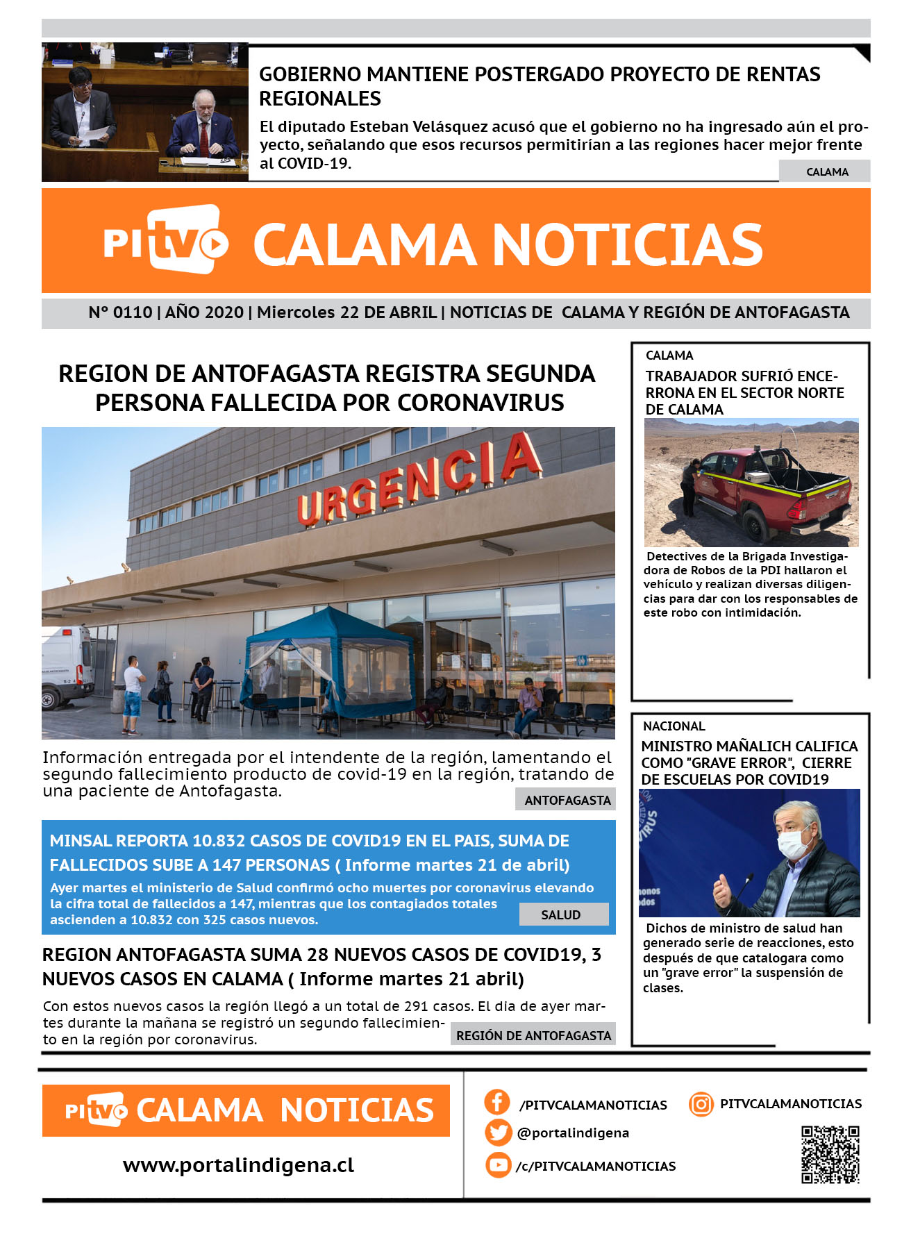 Portada Nº 110 Miercoles 22 de Abril de 2020 Por PITV Calama Noticias Miércoles 22 Abril 2020 | 08:00 Share FacebookTwitterWhatsApp VISITAS 105 Lo más leido Contraloría toma razón de Decreto que obliga a empresas de transporte vincular nombres de pasajeros con equipajes para combatir el “Narco Equipaje” 10 de Julio de 2024 Bienes Nacionales notifica desalojo de inmuebles fiscales ubicados en sector Sur de la extensión Puerto Seco en Calama 9 de Octubre de 2024 Doctora venezolana se mantiene internada en estado crítico en Hospital de Calama: Fue encontrada muy mal herida al interior de su departamento 29 de Septiembre de 2025 Autorizan adelantar las vacaciones de invierno para establecimientos educacionales municipales de Calama 13 de Junio de 2024 PITV Calama Noticiashttps://www.pitvcalamanoticias.cl Share FacebookTwitterWhatsApp Previous articleIMPUTADO BENEFICIADO CON ARRESTO DOMICILIARIO POR COVID19 VIOLÓ A SU EX PAREJANext articleSEREMI DE SALUD CURSA 3 SUMARIOS POR NO USO DE MASCARILLA EN LUGARES PÚBLICOS CERRADOS También puedes leer Fiscalización migratoria en Calama deja 10 extranjeros denunciados y una persona detenida 18 de Marzo de 2026 Alcalde Eliecer Chamorro fortalece coordinación con el nuevo Delegado Presidencial de El Loa para avanzar en seguridad y desarrollo comunal 18 de Marzo de 2026 Amplían detención de principal sospechosa de homicidio de menor en Antofagasta 18 de Marzo de 2026 113 Lo Último Fiscalización migratoria en Calama deja 10 extranjeros denunciados y una persona detenida 18 de Marzo de 2026 Alcalde Eliecer Chamorro fortalece coordinación con el nuevo Delegado Presidencial de El Loa para avanzar en seguridad y desarrollo comunal 18 de Marzo de 2026