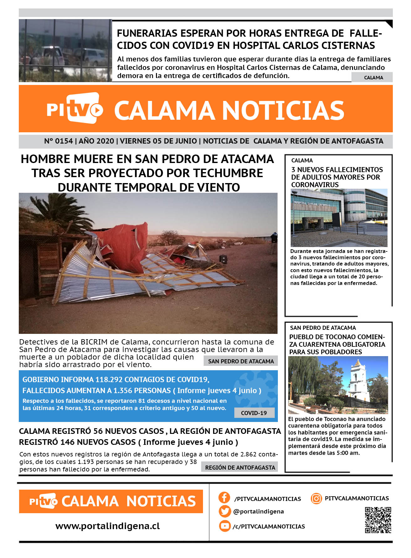 Portada Nº 154 Viernes 05 de Junio de 2020 Por PITV Calama Noticias Viernes 5 Junio 2020 | 08:00 Share FacebookTwitterWhatsApp VISITAS 264 Lo más leido Contraloría toma razón de Decreto que obliga a empresas de transporte vincular nombres de pasajeros con equipajes para combatir el “Narco Equipaje” 10 de Julio de 2024 Bienes Nacionales notifica desalojo de inmuebles fiscales ubicados en sector Sur de la extensión Puerto Seco en Calama 9 de Octubre de 2024 Doctora venezolana se mantiene internada en estado crítico en Hospital de Calama: Fue encontrada muy mal herida al interior de su departamento 29 de Septiembre de 2025 Autorizan adelantar las vacaciones de invierno para establecimientos educacionales municipales de Calama 13 de Junio de 2024 PITV Calama Noticiashttps://www.pitvcalamanoticias.cl Share FacebookTwitterWhatsApp Previous articleCALAMA LAMENTA 3 NUEVOS FALLECIMIENTOS DE ADULTOS MAYORES POR CORONAVIRUSNext articleGOBIERNO INFORMA 122.499 CONTAGIOS DE COVID-19 EN EL PAIS, SUMA DE FALLECIDOS AUMENTA A 1.448 PERSONAS También puedes leer PDI esclarece hallazgo de dedo humano en Calama y descarta delito 18 de Marzo de 2026 Fiscalización migratoria en Calama deja 10 extranjeros denunciados y una persona detenida 18 de Marzo de 2026 Alcalde Eliecer Chamorro fortalece coordinación con el nuevo Delegado Presidencial de El Loa para avanzar en seguridad y desarrollo comunal 18 de Marzo de 2026 89 Lo Último PDI esclarece hallazgo de dedo humano en Calama y descarta delito 18 de Marzo de 2026 Fiscalización migratoria en Calama deja 10 extranjeros denunciados y una persona detenida 18 de Marzo de 2026