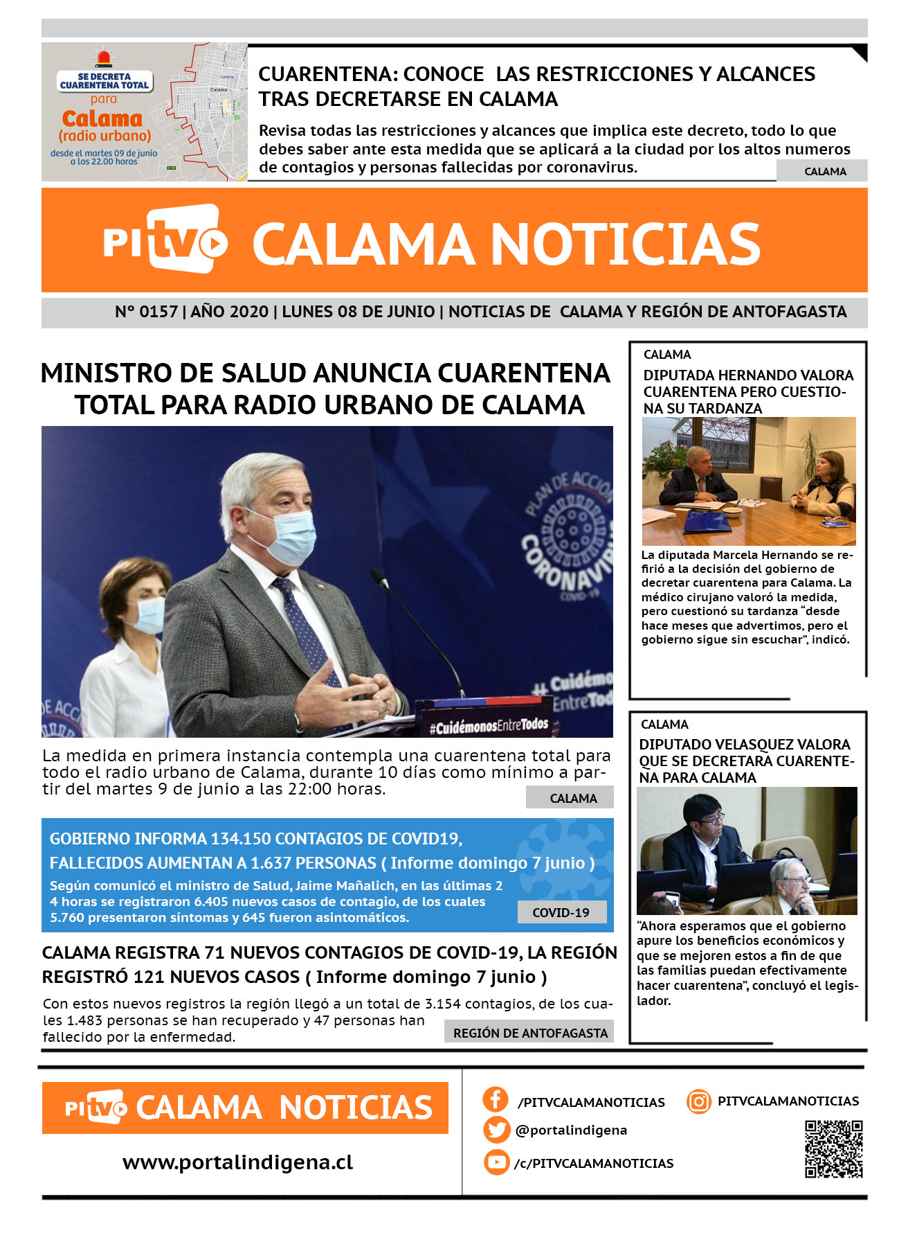 Portada Nº 157 Lunes 08 de Junio de 2020 Por PITV Calama Noticias Lunes 8 Junio 2020 | 17:24 Share FacebookTwitterWhatsApp VISITAS 104 Lo más leido Contraloría toma razón de Decreto que obliga a empresas de transporte vincular nombres de pasajeros con equipajes para combatir el “Narco Equipaje” 10 de Julio de 2024 Bienes Nacionales notifica desalojo de inmuebles fiscales ubicados en sector Sur de la extensión Puerto Seco en Calama 9 de Octubre de 2024 Doctora venezolana se mantiene internada en estado crítico en Hospital de Calama: Fue encontrada muy mal herida al interior de su departamento 29 de Septiembre de 2025 Autorizan adelantar las vacaciones de invierno para establecimientos educacionales municipales de Calama 13 de Junio de 2024 PITV Calama Noticiashttps://www.pitvcalamanoticias.cl [ads1] Share FacebookTwitterWhatsApp Previous article5 AÑOS Y 1 DIA DE CÁRCEL PARA AUTOR DE TRÁFICO DE DROGASNext articleCALAMA REGISTRA 34 NUEVOS CASOS DE COVID19, LA REGION DE ANTOFAGASTA REGISTRA 91 NUEVOS CASOS, SE REGISTRAN 2 PRIMEROS CASOS EN OLLAGUE También puedes leer Juanes pondrá el broche de oro en Show Aniversario 147 de Calama 19 de Marzo de 2026 Hospital de Calama habilitó punto transitorio de vacunación contra la Influenza 2026 19 de Marzo de 2026 1 fallecido tras volcamiento en camino a Socaire (ruta 23ch) 19 de Marzo de 2026 114 Lo Último Juanes pondrá el broche de oro en Show Aniversario 147 de Calama 19 de Marzo de 2026 Hospital de Calama habilitó punto transitorio de vacunación contra la Influenza 2026 19 de Marzo de 2026