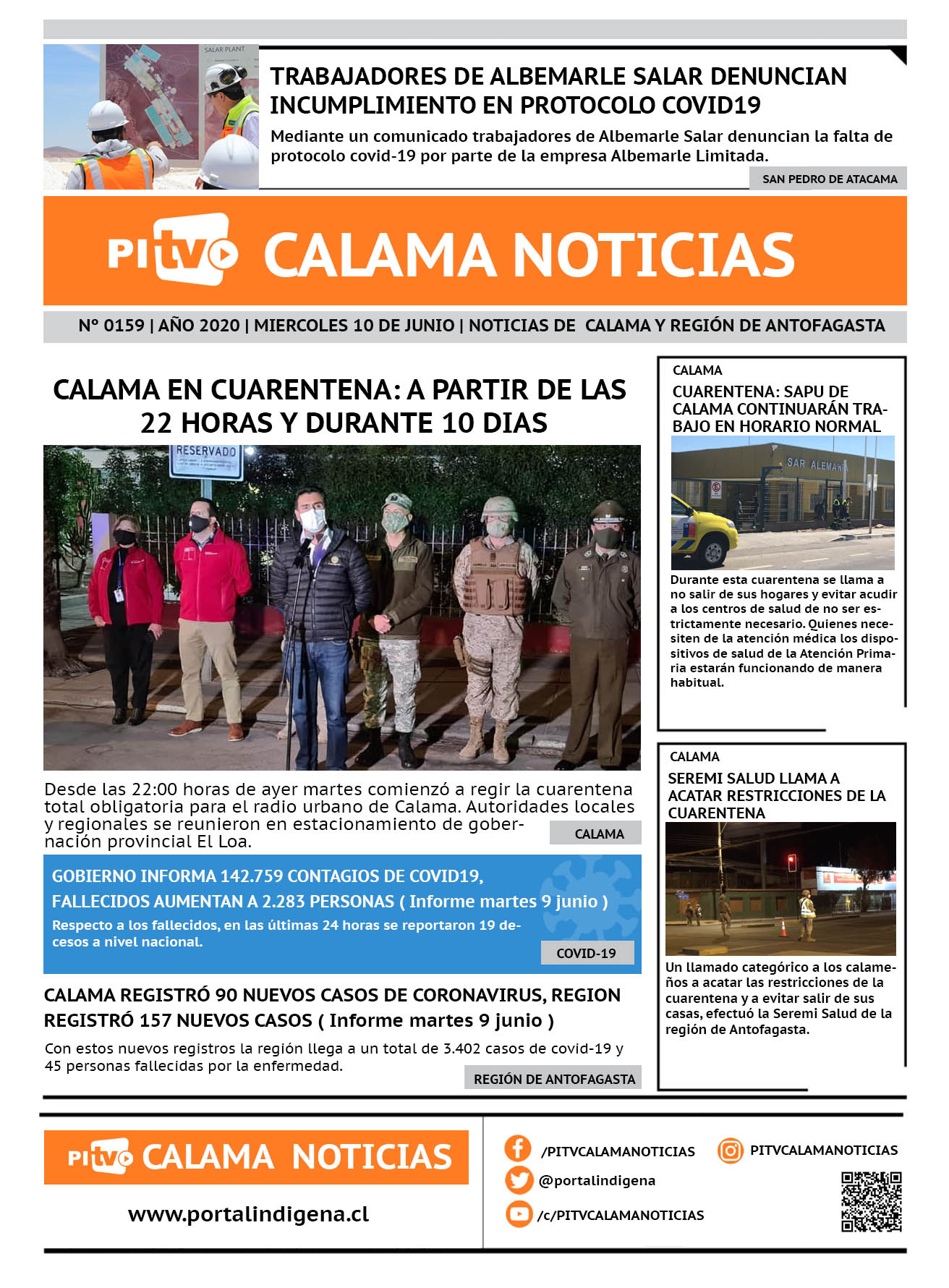 Portada Nº 159 miércoles 10 de Junio de 2020 Por PITV Calama Noticias Miércoles 10 Junio 2020 | 08:00 Share FacebookTwitterWhatsApp VISITAS 78 Lo más leido Contraloría toma razón de Decreto que obliga a empresas de transporte vincular nombres de pasajeros con equipajes para combatir el “Narco Equipaje” 10 de Julio de 2024 Bienes Nacionales notifica desalojo de inmuebles fiscales ubicados en sector Sur de la extensión Puerto Seco en Calama 9 de Octubre de 2024 Doctora venezolana se mantiene internada en estado crítico en Hospital de Calama: Fue encontrada muy mal herida al interior de su departamento 29 de Septiembre de 2025 Autorizan adelantar las vacaciones de invierno para establecimientos educacionales municipales de Calama 13 de Junio de 2024 PITV Calama Noticiashttps://www.pitvcalamanoticias.cl Share FacebookTwitterWhatsApp Previous articleCUARENTENA: SAPU DE CALAMA CONTINUARAN TRABAJANDO EN HORARIO NORMALNext articleGOBIERNO INFORMA 148.496 CONTAGIOS DE COVID19 EN EL PAIS Y 192 PERSONAS FALLECIDAS DESDE ULTIMO INFORME También puedes leer Juanes será el broche del Show Aniversario 147 de Calama 19 de Marzo de 2026 Hospital de Calama habilitó punto transitorio de vacunación contra la Influenza 2026 19 de Marzo de 2026 1 fallecido tras volcamiento en camino a Socaire (ruta 23ch) 19 de Marzo de 2026 104 Lo Último Juanes será el broche del Show Aniversario 147 de Calama 19 de Marzo de 2026 Hospital de Calama habilitó punto transitorio de vacunación contra la Influenza 2026 19 de Marzo de 2026