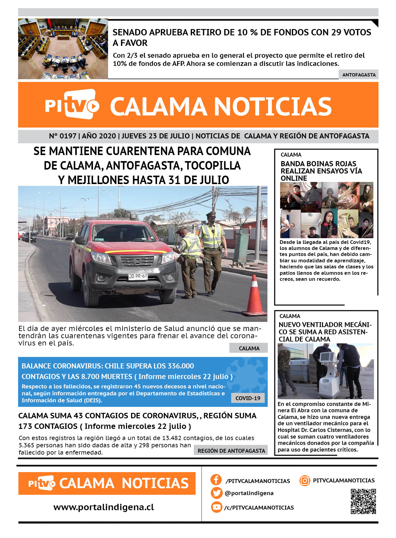Portada Nº 197 Jueves 23 de Julio de 2020 Por PITV Calama Noticias Jueves 23 Julio 2020 | 08:00 Share FacebookTwitterWhatsApp VISITAS 299 Lo más leido Contraloría toma razón de Decreto que obliga a empresas de transporte vincular nombres de pasajeros con equipajes para combatir el “Narco Equipaje” 10 de Julio de 2024 Bienes Nacionales notifica desalojo de inmuebles fiscales ubicados en sector Sur de la extensión Puerto Seco en Calama 9 de Octubre de 2024 Doctora venezolana se mantiene internada en estado crítico en Hospital de Calama: Fue encontrada muy mal herida al interior de su departamento 29 de Septiembre de 2025 Autorizan adelantar las vacaciones de invierno para establecimientos educacionales municipales de Calama 13 de Junio de 2024 PITV Calama Noticiashttps://www.pitvcalamanoticias.cl [ads1] Share FacebookTwitterWhatsApp Previous articleSENADO APRUEBA RETIRO DE 10 % DE FONDOS CON 29 VOTOS A FAVOR (EN LO GENERAL)Next articleCORONAVIRUS: MINSAL REPORTA 116 PERSONAS FALLECIDAS Y 2.371 NUEVOS CONTAGIOS También puedes leer Juanes será el broche del Show Aniversario 147 de Calama 19 de Marzo de 2026 Hospital de Calama habilitó punto transitorio de vacunación contra la Influenza 2026 19 de Marzo de 2026 1 fallecido tras volcamiento en camino a Socaire (ruta 23ch) 19 de Marzo de 2026 174 Lo Último Juanes será el broche del Show Aniversario 147 de Calama 19 de Marzo de 2026 Hospital de Calama habilitó punto transitorio de vacunación contra la Influenza 2026 19 de Marzo de 2026