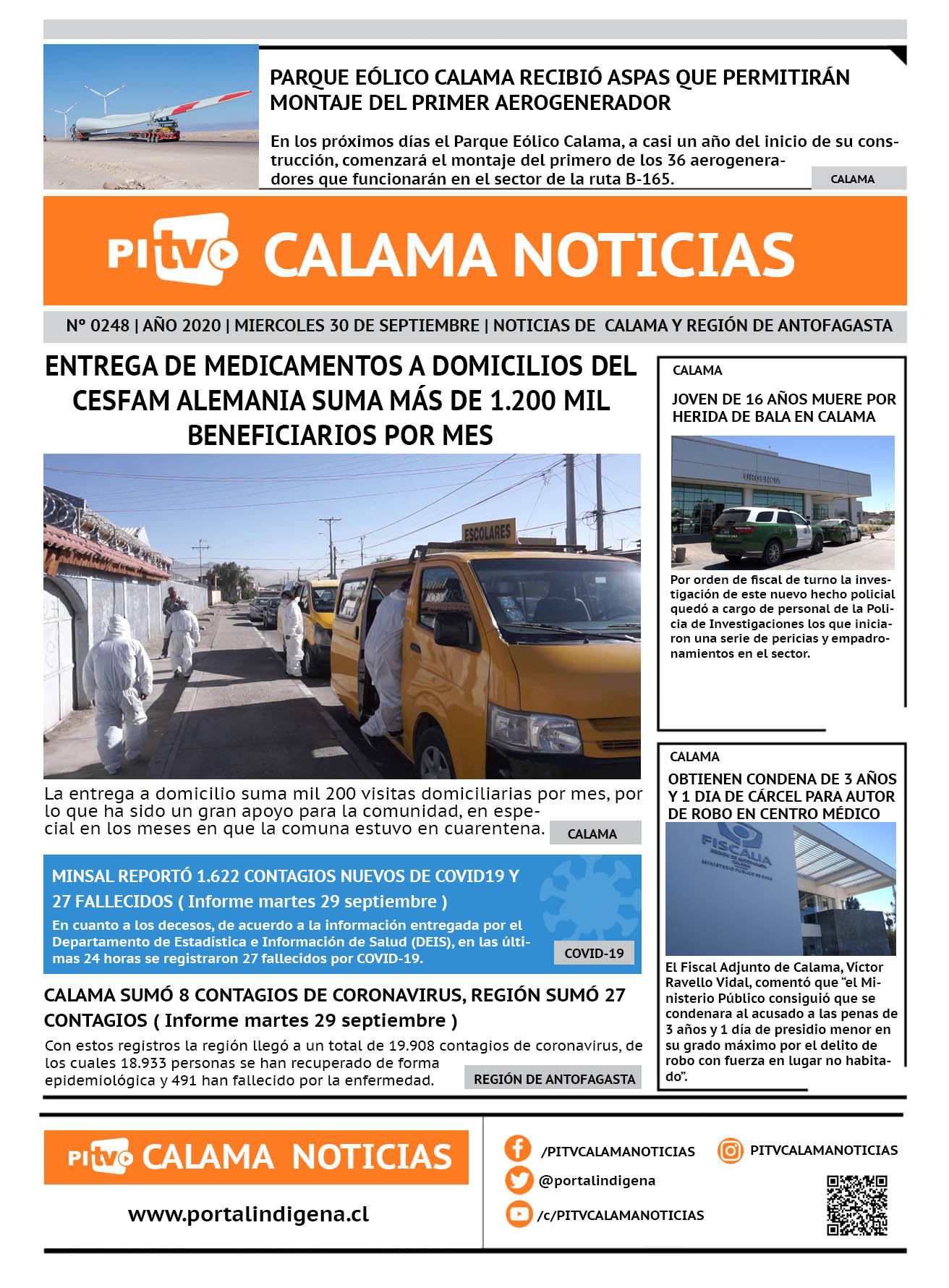 Portada Nº 248 Miercoles 30 de Septiembre de 2020 Por PITV Calama Noticias Miércoles 30 Septiembre 2020 | 08:00 Share FacebookTwitterWhatsApp VISITAS 58 Lo más leido Contraloría toma razón de Decreto que obliga a empresas de transporte vincular nombres de pasajeros con equipajes para combatir el “Narco Equipaje” 10 de Julio de 2024 Bienes Nacionales notifica desalojo de inmuebles fiscales ubicados en sector Sur de la extensión Puerto Seco en Calama 9 de Octubre de 2024 Doctora venezolana se mantiene internada en estado crítico en Hospital de Calama: Fue encontrada muy mal herida al interior de su departamento 29 de Septiembre de 2025 Autorizan adelantar las vacaciones de invierno para establecimientos educacionales municipales de Calama 13 de Junio de 2024 PITV Calama Noticiashttps://www.pitvcalamanoticias.cl Share FacebookTwitterWhatsApp Previous articleENTREGA DE MEDICAMENTOS A DOMICILIOS DEL CESFAM ALEMANIA SUMA MÁS DE 1.200 MIL BENEFICIARIOS POR MESNext articleDIPUTADO VELÁSQUEZ OFICIÓ AL MINISTERIO DEL INTERIOR PARA QUE SE ACLARE SITUACIÓN DE INMIGRANTES VENEZOLANOS También puedes leer PDI esclarece hallazgo de dedo humano en Calama y descarta delito 18 de Marzo de 2026 Fiscalización migratoria en Calama deja 10 extranjeros denunciados y una persona detenida 18 de Marzo de 2026 Alcalde Eliecer Chamorro fortalece coordinación con el nuevo Delegado Presidencial de El Loa para avanzar en seguridad y desarrollo comunal 18 de Marzo de 2026 86 Lo Último PDI esclarece hallazgo de dedo humano en Calama y descarta delito 18 de Marzo de 2026 Fiscalización migratoria en Calama deja 10 extranjeros denunciados y una persona detenida 18 de Marzo de 2026