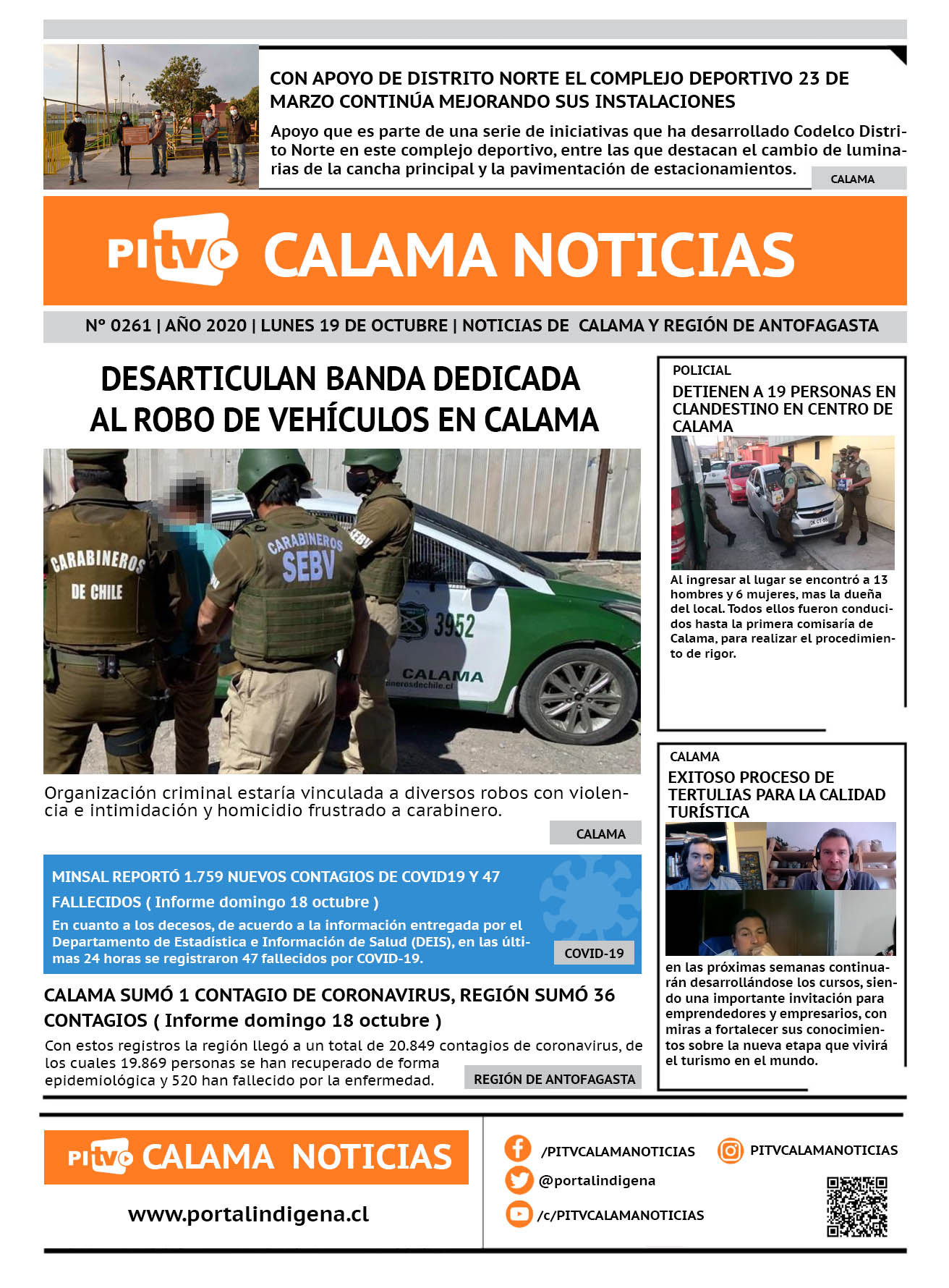 Portada Nº 261 Lunes 19 de Octubre de 2020 Por PITV Calama Noticias Lunes 19 Octubre 2020 | 08:00 Share FacebookTwitterWhatsApp VISITAS 57 Lo más leido Contraloría toma razón de Decreto que obliga a empresas de transporte vincular nombres de pasajeros con equipajes para combatir el “Narco Equipaje” 10 de Julio de 2024 Bienes Nacionales notifica desalojo de inmuebles fiscales ubicados en sector Sur de la extensión Puerto Seco en Calama 9 de Octubre de 2024 Doctora venezolana se mantiene internada en estado crítico en Hospital de Calama: Fue encontrada muy mal herida al interior de su departamento 29 de Septiembre de 2025 Autorizan adelantar las vacaciones de invierno para establecimientos educacionales municipales de Calama 13 de Junio de 2024 PITV Calama Noticiashttps://www.pitvcalamanoticias.cl Share FacebookTwitterWhatsApp Previous articleDETIENEN A 19 PERSONAS EN CLANDESTINO EN CENTRO DE CALAMANext articleCALAMA AVANZA A FASE 3 PREPARACIÓN : CONOCE LAS MEDIDAS QUE SIGUEN RIGIENDO También puedes leer Hospital de Calama habilitó punto transitorio de vacunación contra la Influenza 2026 19 de Marzo de 2026 1 fallecido tras volcamiento en camino a Socaire (ruta 23ch) 19 de Marzo de 2026 Minera El Abra, filial de Freeport-McMoRan ingresa Proyecto de Continuidad Operacional para evaluación ambiental 19 de Marzo de 2026 82 Lo Último Hospital de Calama habilitó punto transitorio de vacunación contra la Influenza 2026 19 de Marzo de 2026 1 fallecido tras volcamiento en camino a Socaire (ruta 23ch) 19 de Marzo de 2026