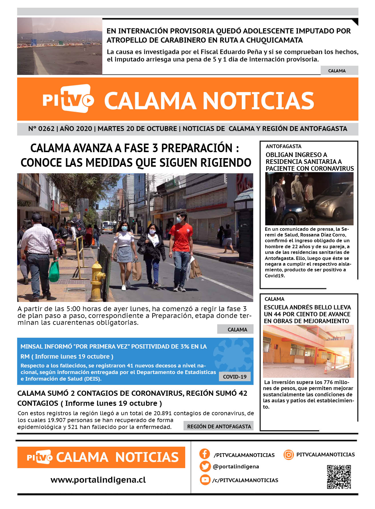 Portada Nº 262 Martes 20 de Octubre de 2020 Por PITV Calama Noticias Martes 20 Octubre 2020 | 08:00 Share FacebookTwitterWhatsApp VISITAS 70 Lo más leido Contraloría toma razón de Decreto que obliga a empresas de transporte vincular nombres de pasajeros con equipajes para combatir el “Narco Equipaje” 10 de Julio de 2024 Bienes Nacionales notifica desalojo de inmuebles fiscales ubicados en sector Sur de la extensión Puerto Seco en Calama 9 de Octubre de 2024 Doctora venezolana se mantiene internada en estado crítico en Hospital de Calama: Fue encontrada muy mal herida al interior de su departamento 29 de Septiembre de 2025 Autorizan adelantar las vacaciones de invierno para establecimientos educacionales municipales de Calama 13 de Junio de 2024 PITV Calama Noticiashttps://www.pitvcalamanoticias.cl Share FacebookTwitterWhatsApp Previous article1 DETENIDO POR DAÑOS A LA PROPIEDAD Y 9 POR DESORDENES EN MANIFESTACIÓN POR EL 18 O EN CALAMANext articleMINSAL REPORTÓ 1.099 NUEVOS CONTAGIOS DE CORONAVIRUS Y 26 FALLECIDOS También puedes leer PDI esclarece hallazgo de dedo humano en Calama y descarta delito 18 de Marzo de 2026 Fiscalización migratoria en Calama deja 10 extranjeros denunciados y una persona detenida 18 de Marzo de 2026 Alcalde Eliecer Chamorro fortalece coordinación con el nuevo Delegado Presidencial de El Loa para avanzar en seguridad y desarrollo comunal 18 de Marzo de 2026 79 Lo Último PDI esclarece hallazgo de dedo humano en Calama y descarta delito 18 de Marzo de 2026 Fiscalización migratoria en Calama deja 10 extranjeros denunciados y una persona detenida 18 de Marzo de 2026