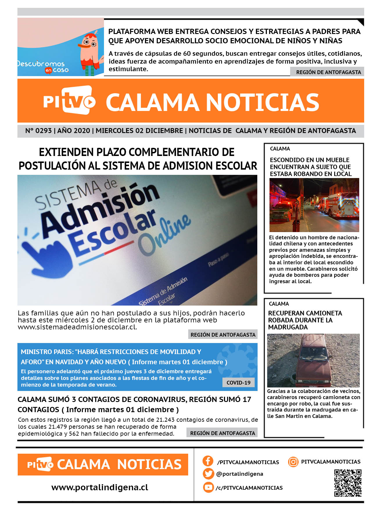 Portada Nº 293 Miercoles 02 de Diciembre de 2020 Por PITV Calama Noticias Miércoles 2 Diciembre 2020 | 08:00 Share FacebookTwitterWhatsApp VISITAS 104 Lo más leido Contraloría toma razón de Decreto que obliga a empresas de transporte vincular nombres de pasajeros con equipajes para combatir el “Narco Equipaje” 10 de Julio de 2024 Bienes Nacionales notifica desalojo de inmuebles fiscales ubicados en sector Sur de la extensión Puerto Seco en Calama 9 de Octubre de 2024 Doctora venezolana se mantiene internada en estado crítico en Hospital de Calama: Fue encontrada muy mal herida al interior de su departamento 29 de Septiembre de 2025 Autorizan adelantar las vacaciones de invierno para establecimientos educacionales municipales de Calama 13 de Junio de 2024 PITV Calama Noticiashttps://www.pitvcalamanoticias.cl Share FacebookTwitterWhatsApp Previous articleRECUPERAN CAMIONETA ROBADA DURANTE LA MADRUGADANext article5 DETENIDOS POR RECEPTACIÓN DE VEHICULOS También puedes leer Carabineros detiene a tres sujetos por tráfico de drogas en Calama 17 de Marzo de 2026 Gobierno ingresa primeras urgencias legislativas con dos iniciativas de Boric con discusión inmediata 17 de Marzo de 2026 Tres detenidos por millonaria internación ilegal de cigarrillos: Contrabando venía oculto en dos camiones 17 de Marzo de 2026 116 Lo Último Carabineros detiene a tres sujetos por tráfico de drogas en Calama 17 de Marzo de 2026 Gobierno ingresa primeras urgencias legislativas con dos iniciativas de Boric con discusión inmediata 17 de Marzo de 2026