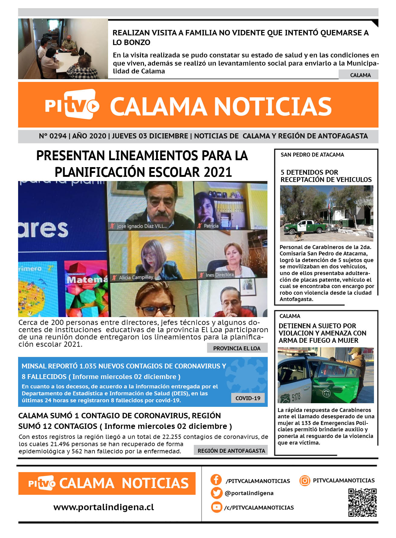 Portada Nº 294 Jueves 03 de Diciembre de 2020 Por PITV Calama Noticias Jueves 3 Diciembre 2020 | 08:00 Share FacebookTwitterWhatsApp VISITAS 87 Lo más leido Contraloría toma razón de Decreto que obliga a empresas de transporte vincular nombres de pasajeros con equipajes para combatir el “Narco Equipaje” 10 de Julio de 2024 Bienes Nacionales notifica desalojo de inmuebles fiscales ubicados en sector Sur de la extensión Puerto Seco en Calama 9 de Octubre de 2024 Doctora venezolana se mantiene internada en estado crítico en Hospital de Calama: Fue encontrada muy mal herida al interior de su departamento 29 de Septiembre de 2025 Autorizan adelantar las vacaciones de invierno para establecimientos educacionales municipales de Calama 13 de Junio de 2024 PITV Calama Noticiashttps://www.pitvcalamanoticias.cl Share FacebookTwitterWhatsApp Previous articleREALIZAN VISITA A FAMILIA NO VIDENTE QUE INTENTÓ QUEMARSE A LO BONZONext articleDETIENEN A SUJETO POR ROBO FRUSTRADO EN BOTILLERIA También puedes leer Carabineros detiene a tres sujetos por tráfico de drogas en Calama 17 de Marzo de 2026 Gobierno ingresa primeras urgencias legislativas con dos iniciativas de Boric con discusión inmediata 17 de Marzo de 2026 Tres detenidos por millonaria internación ilegal de cigarrillos: Contrabando venía oculto en dos camiones 17 de Marzo de 2026 104 Lo Último Carabineros detiene a tres sujetos por tráfico de drogas en Calama 17 de Marzo de 2026 Gobierno ingresa primeras urgencias legislativas con dos iniciativas de Boric con discusión inmediata 17 de Marzo de 2026