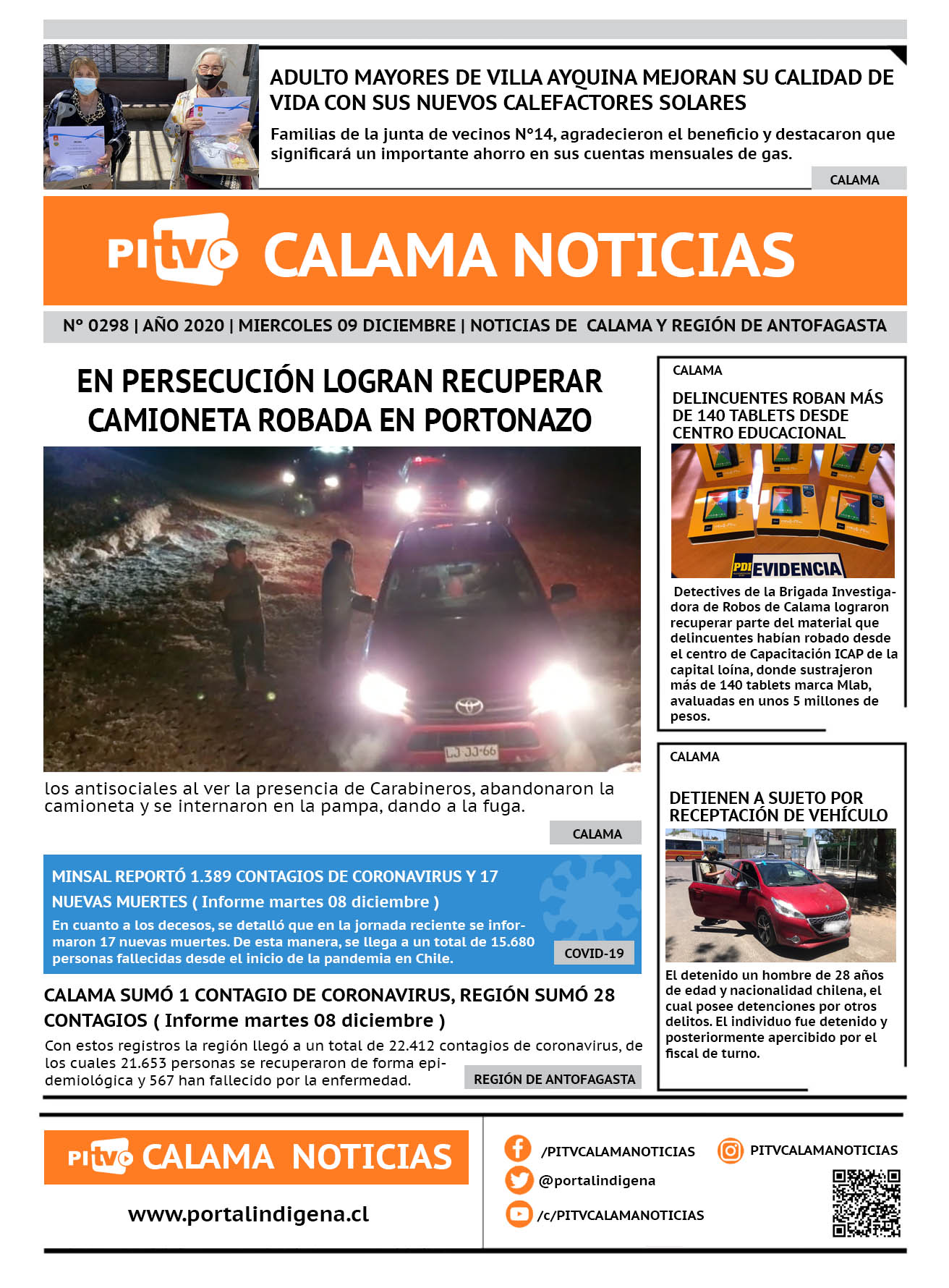 Portada Nº 298 Miercoles 09 de Diciembre de 2020 Por PITV Calama Noticias Miércoles 9 Diciembre 2020 | 08:00 Share FacebookTwitterWhatsApp VISITAS 102 Lo más leido Contraloría toma razón de Decreto que obliga a empresas de transporte vincular nombres de pasajeros con equipajes para combatir el “Narco Equipaje” 10 de Julio de 2024 Bienes Nacionales notifica desalojo de inmuebles fiscales ubicados en sector Sur de la extensión Puerto Seco en Calama 9 de Octubre de 2024 Doctora venezolana se mantiene internada en estado crítico en Hospital de Calama: Fue encontrada muy mal herida al interior de su departamento 29 de Septiembre de 2025 Autorizan adelantar las vacaciones de invierno para establecimientos educacionales municipales de Calama 13 de Junio de 2024 PITV Calama Noticiashttps://www.pitvcalamanoticias.cl Share FacebookTwitterWhatsApp Previous articleDETIENEN A SUJETO QUE SE ENCONTRABA ROBANDO EN CENTRICO LOCAL DE COMIDA EN CALAMANext articleINVESTIGAN FALLECIMIENTO DE HOMBRE TRAS ROBO A FERRETERÍA También puedes leer PDI despliega fiscalización migratoria masiva en Antofagasta y concreta detenciones por infracciones y expulsión vigente 17 de Marzo de 2026 Carabineros detiene a tres sujetos por tráfico de drogas en Calama 17 de Marzo de 2026 Gobierno ingresa primeras urgencias legislativas con dos iniciativas de Boric con discusión inmediata 17 de Marzo de 2026 143 Lo Último PDI despliega fiscalización migratoria masiva en Antofagasta y concreta detenciones por infracciones y expulsión vigente 17 de Marzo de 2026 Carabineros detiene a tres sujetos por tráfico de drogas en Calama 17 de Marzo de 2026