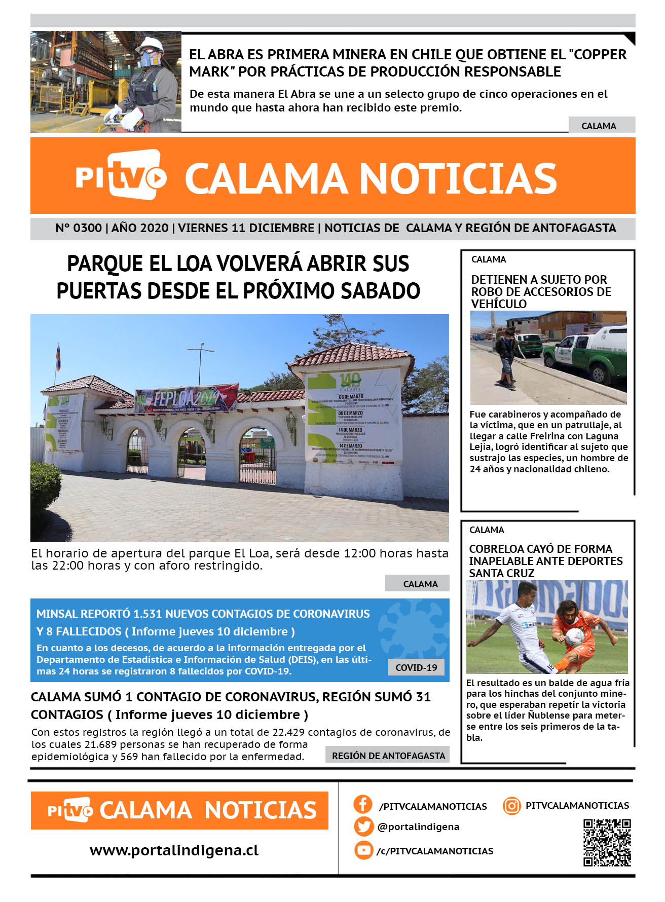 Portada Nº 300 Viernes 11 de Diciembre de 2020 Por Ricardo Pinto Viernes 11 Diciembre 2020 | 08:00 Share FacebookTwitterWhatsApp VISITAS 127 Lo más leido Contraloría toma razón de Decreto que obliga a empresas de transporte vincular nombres de pasajeros con equipajes para combatir el “Narco Equipaje” 10 de Julio de 2024 Bienes Nacionales notifica desalojo de inmuebles fiscales ubicados en sector Sur de la extensión Puerto Seco en Calama 9 de Octubre de 2024 Doctora venezolana se mantiene internada en estado crítico en Hospital de Calama: Fue encontrada muy mal herida al interior de su departamento 29 de Septiembre de 2025 Autorizan adelantar las vacaciones de invierno para establecimientos educacionales municipales de Calama 13 de Junio de 2024 Ricardo Pinto Share FacebookTwitterWhatsApp Previous articleEL ABRA ES PRIMERA MINERA EN CHILE QUE OBTIENE EL “COPPER MARK” POR PRÁCTICAS DE PRODUCCIÓN RESPONSABLENext articleDOS BOLIVIANOS FUERON DETENIDOS POR TRÁFICO DE DROGA AL INTERIOR DE UN BUS También puedes leer Investigan muerte de menor de 5 años en Antofagasta: hay una detenida 17 de Marzo de 2026 PDI despliega fiscalización migratoria masiva en Antofagasta y concreta detenciones por infracciones y expulsión vigente 17 de Marzo de 2026 Carabineros detiene a tres sujetos por tráfico de drogas en Calama 17 de Marzo de 2026 90 Lo Último Investigan muerte de menor de 5 años en Antofagasta: hay una detenida 17 de Marzo de 2026 PDI despliega fiscalización migratoria masiva en Antofagasta y concreta detenciones por infracciones y expulsión vigente 17 de Marzo de 2026