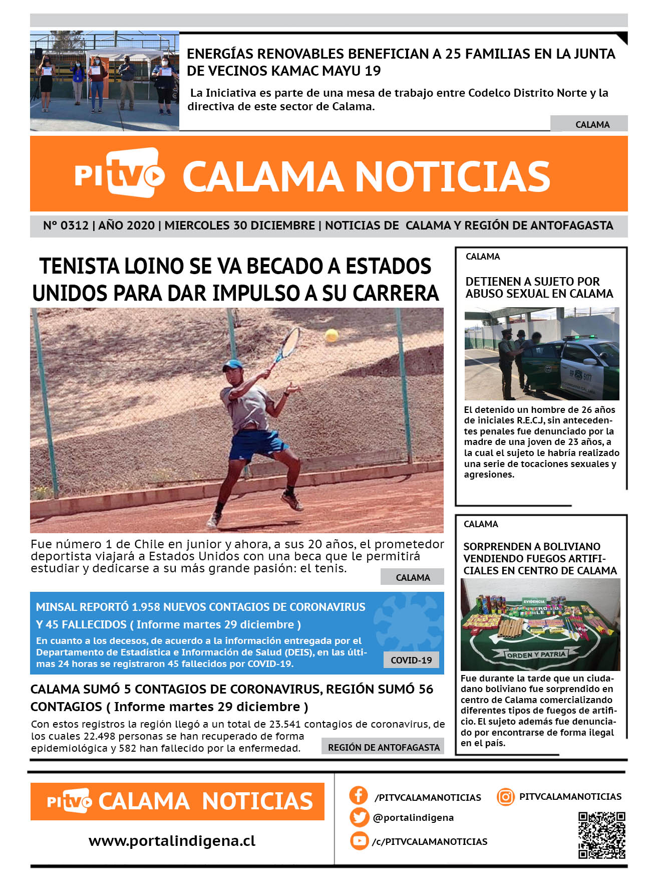 Portada Nº 312 Miercoles 30 de Diciembre de 2020 Por Ricardo Pinto Miércoles 30 Diciembre 2020 | 01:22 Share FacebookTwitterWhatsApp VISITAS 53 Lo más leido Contraloría toma razón de Decreto que obliga a empresas de transporte vincular nombres de pasajeros con equipajes para combatir el “Narco Equipaje” 10 de Julio de 2024 Bienes Nacionales notifica desalojo de inmuebles fiscales ubicados en sector Sur de la extensión Puerto Seco en Calama 9 de Octubre de 2024 Doctora venezolana se mantiene internada en estado crítico en Hospital de Calama: Fue encontrada muy mal herida al interior de su departamento 29 de Septiembre de 2025 Autorizan adelantar las vacaciones de invierno para establecimientos educacionales municipales de Calama 13 de Junio de 2024 Ricardo Pinto Share FacebookTwitterWhatsApp Previous articleSORPRENDEN A BOLIVIANO VENDIENDO FUEGOS ARTIFICIALES EN CENTRO DE CALAMANext articleCOBRELOA EMPATÓ EN CALAMA Y SUMA A PATRICIO GALAZ COMO DIRECTOR DEPORTIVO PENSANDO EN EL 2021 También puedes leer Investigan muerte de menor de 5 años en Antofagasta: hay una detenida 17 de Marzo de 2026 PDI despliega fiscalización migratoria masiva en Antofagasta y concreta detenciones por infracciones y expulsión vigente 17 de Marzo de 2026 Carabineros detiene a tres sujetos por tráfico de drogas en Calama 17 de Marzo de 2026 90 Lo Último Investigan muerte de menor de 5 años en Antofagasta: hay una detenida 17 de Marzo de 2026 PDI despliega fiscalización migratoria masiva en Antofagasta y concreta detenciones por infracciones y expulsión vigente 17 de Marzo de 2026
