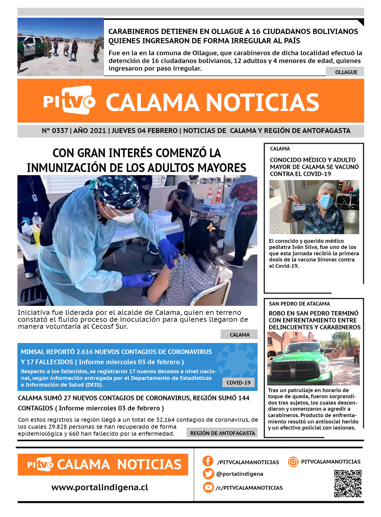Portada Nº 337 Jueves 04 de Febrero de 2021 Por Ricardo Pinto Jueves 4 Febrero 2021 | 08:00 Share FacebookTwitterWhatsApp VISITAS 44 Lo más leido Contraloría toma razón de Decreto que obliga a empresas de transporte vincular nombres de pasajeros con equipajes para combatir el “Narco Equipaje” 10 de Julio de 2024 Bienes Nacionales notifica desalojo de inmuebles fiscales ubicados en sector Sur de la extensión Puerto Seco en Calama 9 de Octubre de 2024 Doctora venezolana se mantiene internada en estado crítico en Hospital de Calama: Fue encontrada muy mal herida al interior de su departamento 29 de Septiembre de 2025 Autorizan adelantar las vacaciones de invierno para establecimientos educacionales municipales de Calama 13 de Junio de 2024 Ricardo Pinto Share FacebookTwitterWhatsApp Previous articleCON GRAN INTERÉS COMENZÓ LA INMUNIZACIÓN DE LOS ADULTOS MAYORESNext articleDINKA LÓPEZ SIGUE EN CARRERA PARA CONVERTIRSE EN LA PRIMERA ALCALDESA DE CALAMA También puedes leer Hospital de Calama habilitó punto transitorio de vacunación contra la Influenza 2026 19 de Marzo de 2026 1 fallecido tras volcamiento en camino a Socaire (ruta 23ch) 19 de Marzo de 2026 Minera El Abra, filial de Freeport-McMoRan ingresa Proyecto de Continuidad Operacional para evaluación ambiental 19 de Marzo de 2026 55 Lo Último Hospital de Calama habilitó punto transitorio de vacunación contra la Influenza 2026 19 de Marzo de 2026 1 fallecido tras volcamiento en camino a Socaire (ruta 23ch) 19 de Marzo de 2026