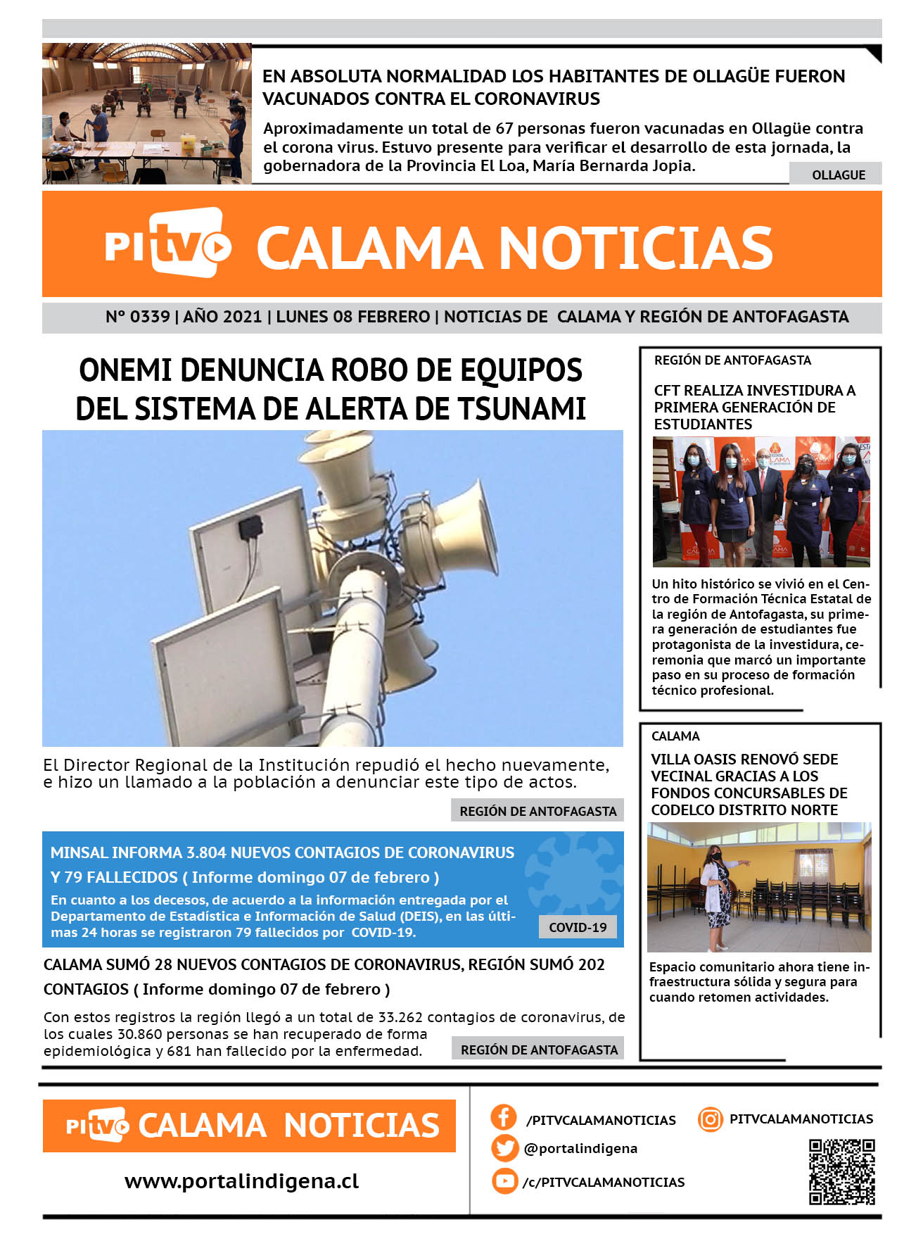 Portada Nº 339 Lunes 08 de Febrero de 2021 Por Ricardo Pinto Lunes 8 Febrero 2021 | 08:00 Share FacebookTwitterWhatsApp VISITAS 52 Lo más leido Contraloría toma razón de Decreto que obliga a empresas de transporte vincular nombres de pasajeros con equipajes para combatir el “Narco Equipaje” 10 de Julio de 2024 Bienes Nacionales notifica desalojo de inmuebles fiscales ubicados en sector Sur de la extensión Puerto Seco en Calama 9 de Octubre de 2024 Doctora venezolana se mantiene internada en estado crítico en Hospital de Calama: Fue encontrada muy mal herida al interior de su departamento 29 de Septiembre de 2025 Autorizan adelantar las vacaciones de invierno para establecimientos educacionales municipales de Calama 13 de Junio de 2024 Ricardo Pinto Share FacebookTwitterWhatsApp Previous articleVILLA OASIS RENOVÓ SEDE VECINAL GRACIAS A LOS FONDOS CONCURSABLES DE CODELCO DISTRITO NORTENext articleMINSAL REPORTÓ 3.464 NUEVOS CONTAGIOS DE CORONAVIRUS Y 82 FALLECIMIENTOS También puedes leer Hospital de Calama habilitó punto transitorio de vacunación contra la Influenza 2026 19 de Marzo de 2026 1 fallecido tras volcamiento en camino a Socaire (ruta 23ch) 19 de Marzo de 2026 Minera El Abra, filial de Freeport-McMoRan ingresa Proyecto de Continuidad Operacional para evaluación ambiental 19 de Marzo de 2026 57 Lo Último Hospital de Calama habilitó punto transitorio de vacunación contra la Influenza 2026 19 de Marzo de 2026 1 fallecido tras volcamiento en camino a Socaire (ruta 23ch) 19 de Marzo de 2026
