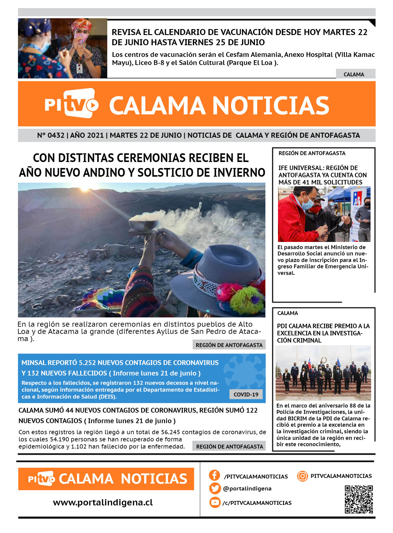 Noticias Portada Nº 432 Martes 22 de Junio de 2021 Por PITV Calama Noticias Martes 22 Junio 2021 | 02:43 Share FacebookTwitterWhatsApp VISITAS 67 Lo más leido Contraloría toma razón de Decreto que obliga a empresas de transporte vincular nombres de pasajeros con equipajes para combatir el “Narco Equipaje” 10 de Julio de 2024 Bienes Nacionales notifica desalojo de inmuebles fiscales ubicados en sector Sur de la extensión Puerto Seco en Calama 9 de Octubre de 2024 Doctora venezolana se mantiene internada en estado crítico en Hospital de Calama: Fue encontrada muy mal herida al interior de su departamento 29 de Septiembre de 2025 Autorizan adelantar las vacaciones de invierno para establecimientos educacionales municipales de Calama 13 de Junio de 2024 PITV Calama Noticiashttps://www.pitvcalamanoticias.cl [ads1] Share FacebookTwitterWhatsApp Previous articleCON DISTINTAS CEREMONIAS RECIBEN EL AÑO NUEVO ANDINO Y SOLSTICIO DE INVIERNO EN LA REGIÓN DE ANTOFAGASTANext articlePDI ANTOFAGASTA LOGRA INCAUTAR ARMA, MUNICIONES Y DROGA EN POBLACIÓN VISTA HERMOSA También puedes leer Presidente José Antonio Kast firmó decreto para construcción de “barreras físicas” para detener el paso irregular en las fronteras del norte del país 12 de Marzo de 2026 Cristian Ramírez y Daniela Vecchiola asumen como Delegados Presidenciales Provinciales en El Loa y Tocopilla respectivamente 12 de Marzo de 2026 Sin sorpresas en el mercado: Cobreloa repite la fórmula mañana a Iquique 12 de Marzo de 2026 90 Lo Último Presidente José Antonio Kast firmó decreto para construcción de “barreras físicas” para detener el paso irregular en las fronteras del norte del país 12 de Marzo de 2026 Cristian Ramírez y Daniela Vecchiola asumen como Delegados Presidenciales Provinciales en El Loa y Tocopilla respectivamente 12 de Marzo de 2026