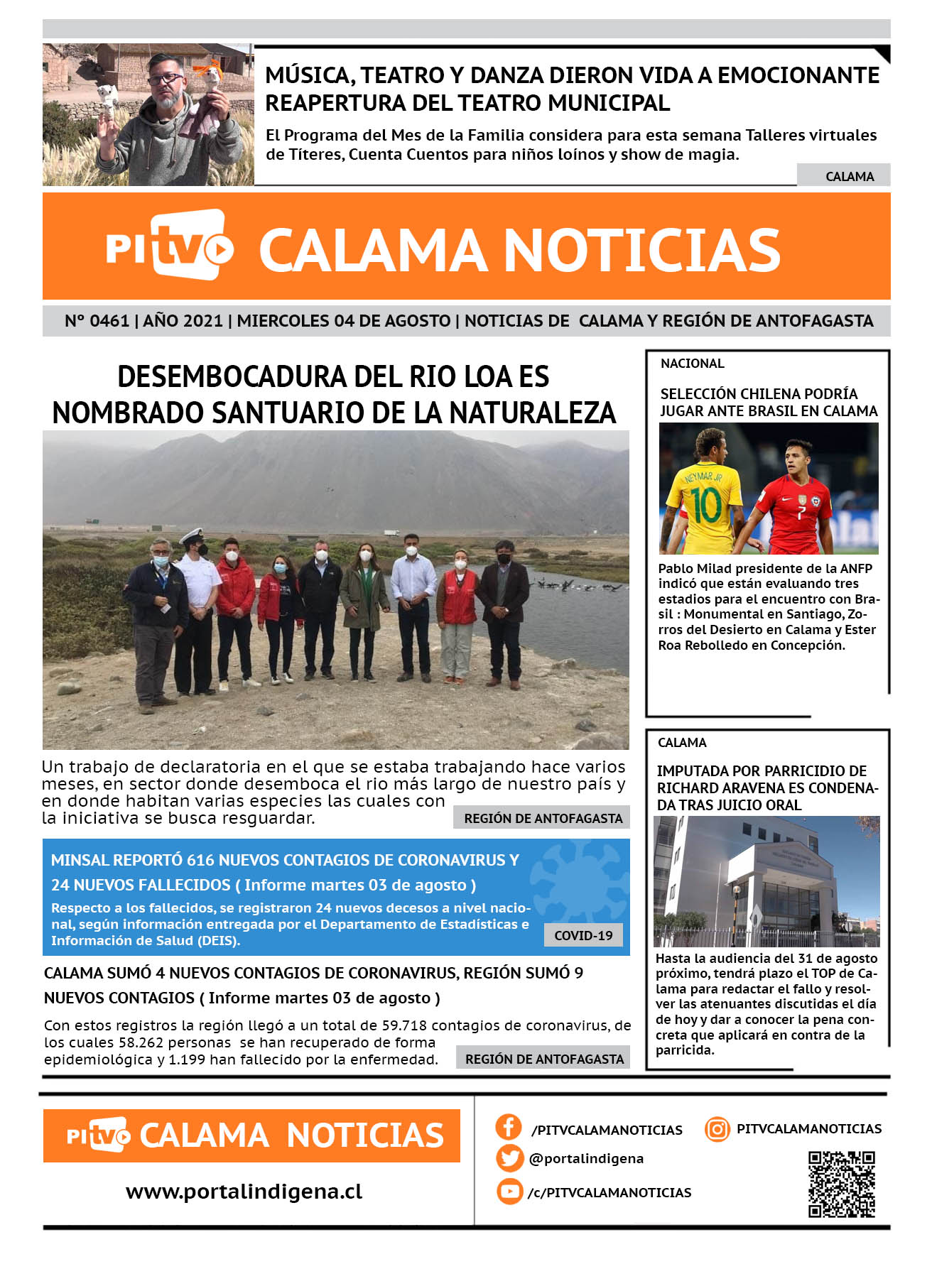 Noticias Portada Nº 461 Miercoles 04 de Agosto de 2021 Por PITV Calama Noticias Miércoles 4 Agosto 2021 | 08:02 Share FacebookTwitterWhatsApp VISITAS 73 Lo más leido Contraloría toma razón de Decreto que obliga a empresas de transporte vincular nombres de pasajeros con equipajes para combatir el “Narco Equipaje” 10 de Julio de 2024 Bienes Nacionales notifica desalojo de inmuebles fiscales ubicados en sector Sur de la extensión Puerto Seco en Calama 9 de Octubre de 2024 Doctora venezolana se mantiene internada en estado crítico en Hospital de Calama: Fue encontrada muy mal herida al interior de su departamento 29 de Septiembre de 2025 Autorizan adelantar las vacaciones de invierno para establecimientos educacionales municipales de Calama 13 de Junio de 2024 PITV Calama Noticiashttps://www.pitvcalamanoticias.cl [ads1] Share FacebookTwitterWhatsApp Previous articleDESEMBOCADURA DEL RIO LOA ES NOMBRADO SANTUARIO DE LA NATURALEZANext articleCONVENCIONAL DE LA REGIÓN DE ANTOFAGASTA HOMENAJEÓ A LA MADRE TIERRA EN LA LENGUA DEL PUEBLO LICKANTAY También puedes leer Absuelven a Cristian Insaurralde de segunda tarjeta amarilla que recibió contra Iquique 18 de Marzo de 2026 Cerco al narcotráfico permite incautación de 1.348 kilos de drogas en dos procedimientos 18 de Marzo de 2026 Investigan muerte de menor de 5 años en Antofagasta: hay una detenida 17 de Marzo de 2026 93 Lo Último Amplían detención de principal sospechosa de homicidio de menor en Antofagasta 18 de Marzo de 2026 Absuelven a Cristian Insaurralde de segunda tarjeta amarilla que recibió contra Iquique 18 de Marzo de 2026