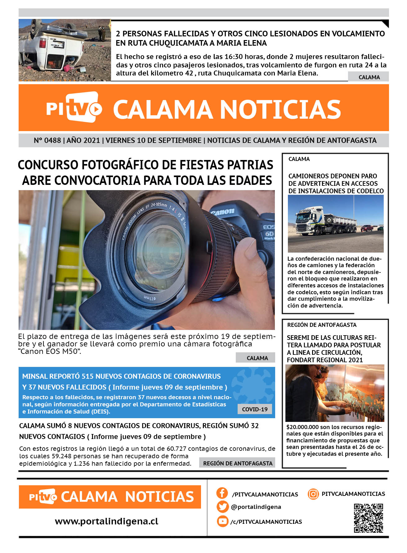 Noticias Portada Nº 488 Viernes 10 de Septiembre de 2021 Por PITV Calama Noticias Viernes 10 Septiembre 2021 | 08:00 Share FacebookTwitterWhatsApp VISITAS 62 Lo más leido Contraloría toma razón de Decreto que obliga a empresas de transporte vincular nombres de pasajeros con equipajes para combatir el “Narco Equipaje” 10 de Julio de 2024 Bienes Nacionales notifica desalojo de inmuebles fiscales ubicados en sector Sur de la extensión Puerto Seco en Calama 9 de Octubre de 2024 Doctora venezolana se mantiene internada en estado crítico en Hospital de Calama: Fue encontrada muy mal herida al interior de su departamento 29 de Septiembre de 2025 Autorizan adelantar las vacaciones de invierno para establecimientos educacionales municipales de Calama 13 de Junio de 2024 PITV Calama Noticiashttps://www.pitvcalamanoticias.cl [ads1] Share FacebookTwitterWhatsApp Previous article2 PERSONAS FALLECIDAS Y OTROS CINCO LESIONADOS EN VOLCAMIENTO EN RUTA CHUQUICAMATA A MARIA ELENANext articleDE MANERA GRADUAL A PARTIR DEL 20 DE SEPTIEMBRE SE RETOMARÁN LAS CLASES PRESENCIALES EN LOS ESTABLECIMIENTOS MUNICIPALES También puedes leer Juanes será el broche del Show Aniversario 147 de Calama 19 de Marzo de 2026 Hospital de Calama habilitó punto transitorio de vacunación contra la Influenza 2026 19 de Marzo de 2026 1 fallecido tras volcamiento en camino a Socaire (ruta 23ch) 19 de Marzo de 2026 81 Lo Último Juanes será el broche del Show Aniversario 147 de Calama 19 de Marzo de 2026 Hospital de Calama habilitó punto transitorio de vacunación contra la Influenza 2026 19 de Marzo de 2026