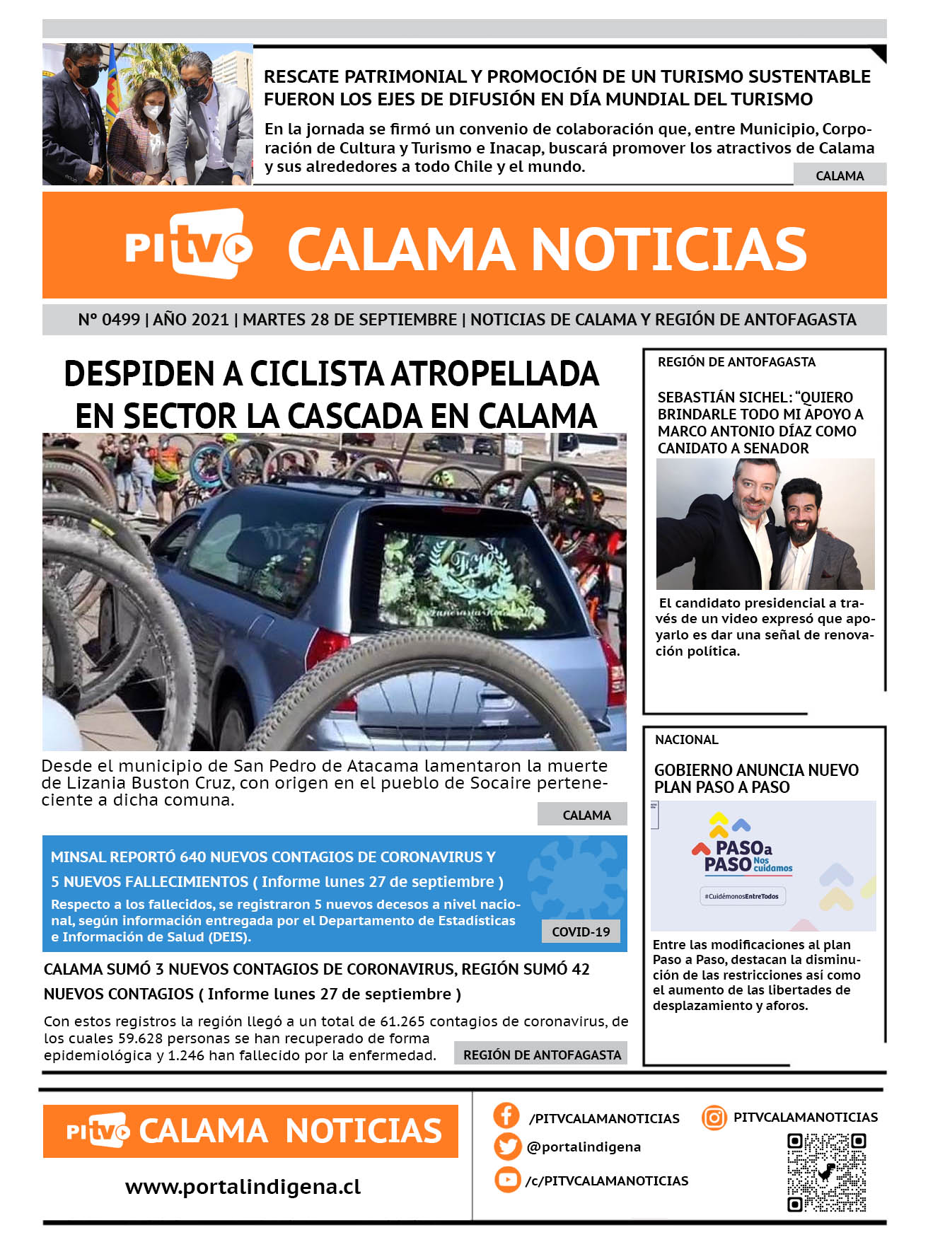 Noticias Portada Nº 499 Martes 28 de Septiembre de 2021 Por PITV Calama Noticias Martes 28 Septiembre 2021 | 08:00 Share FacebookTwitterWhatsApp VISITAS 74 Lo más leido Contraloría toma razón de Decreto que obliga a empresas de transporte vincular nombres de pasajeros con equipajes para combatir el “Narco Equipaje” 10 de Julio de 2024 Bienes Nacionales notifica desalojo de inmuebles fiscales ubicados en sector Sur de la extensión Puerto Seco en Calama 9 de Octubre de 2024 Doctora venezolana se mantiene internada en estado crítico en Hospital de Calama: Fue encontrada muy mal herida al interior de su departamento 29 de Septiembre de 2025 Autorizan adelantar las vacaciones de invierno para establecimientos educacionales municipales de Calama 13 de Junio de 2024 PITV Calama Noticiashttps://www.pitvcalamanoticias.cl [ads1] Share FacebookTwitterWhatsApp Previous articleDESPIDEN A CICLISTA ATROPELLADA EN SECTOR LA CASCADA: ESTE MIERCOLES SE REALIZARÁ LA FORMALIZACIÓN DE CONDUCTORNext articleOS7 DE CARABINEROS LOGRA LA INCAUTACIÓN DE 17 KILOS DE MARIHUANA:1 DETENIDO También puedes leer PDI esclarece hallazgo de dedo humano en Calama y descarta delito 18 de Marzo de 2026 Fiscalización migratoria en Calama deja 10 extranjeros denunciados y una persona detenida 18 de Marzo de 2026 Alcalde Eliecer Chamorro fortalece coordinación con el nuevo Delegado Presidencial de El Loa para avanzar en seguridad y desarrollo comunal 18 de Marzo de 2026 92 Lo Último PDI esclarece hallazgo de dedo humano en Calama y descarta delito 18 de Marzo de 2026 Fiscalización migratoria en Calama deja 10 extranjeros denunciados y una persona detenida 18 de Marzo de 2026
