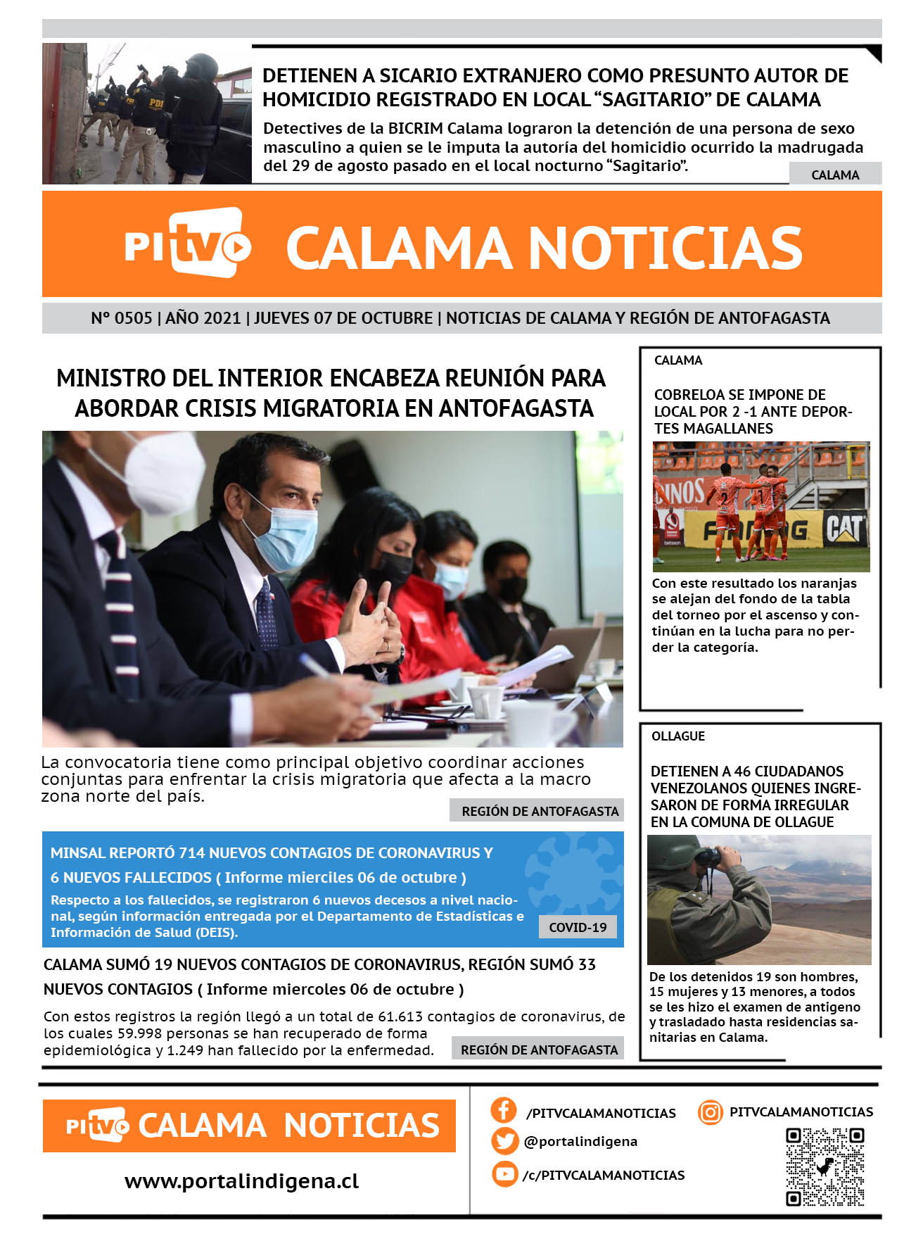 Noticias Portada Nº 505 Jueves 07 de Octubre de 2021 Por PITV Calama Noticias Jueves 7 Octubre 2021 | 08:00 Share FacebookTwitterWhatsApp VISITAS 60 Lo más leido Contraloría toma razón de Decreto que obliga a empresas de transporte vincular nombres de pasajeros con equipajes para combatir el “Narco Equipaje” 10 de Julio de 2024 Bienes Nacionales notifica desalojo de inmuebles fiscales ubicados en sector Sur de la extensión Puerto Seco en Calama 9 de Octubre de 2024 Doctora venezolana se mantiene internada en estado crítico en Hospital de Calama: Fue encontrada muy mal herida al interior de su departamento 29 de Septiembre de 2025 Autorizan adelantar las vacaciones de invierno para establecimientos educacionales municipales de Calama 13 de Junio de 2024 PITV Calama Noticiashttps://www.pitvcalamanoticias.cl [ads1] Share FacebookTwitterWhatsApp Previous articleDETIENEN A SICARIO EXTRANJERO COMO PRESUNTO AUTOR DE HOMICIDIO REGISTRADO EN LOCAL “SAGITARIO” DE CALAMANext articleOCTUBRE TENDRÁ CICLOS DE CINE DE SUSPENSO EN CENTRO DE ARTE OJO DEL DESIERTO También puedes leer Fiscalización migratoria en Calama deja 10 extranjeros denunciados y una persona detenida 18 de Marzo de 2026 Alcalde Eliecer Chamorro fortalece coordinación con el nuevo Delegado Presidencial de El Loa para avanzar en seguridad y desarrollo comunal 18 de Marzo de 2026 Absuelven a Cristian Insaurralde de segunda tarjeta amarilla que recibió contra Iquique 18 de Marzo de 2026 81 Lo Último Fiscalización migratoria en Calama deja 10 extranjeros denunciados y una persona detenida 18 de Marzo de 2026 Alcalde Eliecer Chamorro fortalece coordinación con el nuevo Delegado Presidencial de El Loa para avanzar en seguridad y desarrollo comunal 18 de Marzo de 2026
