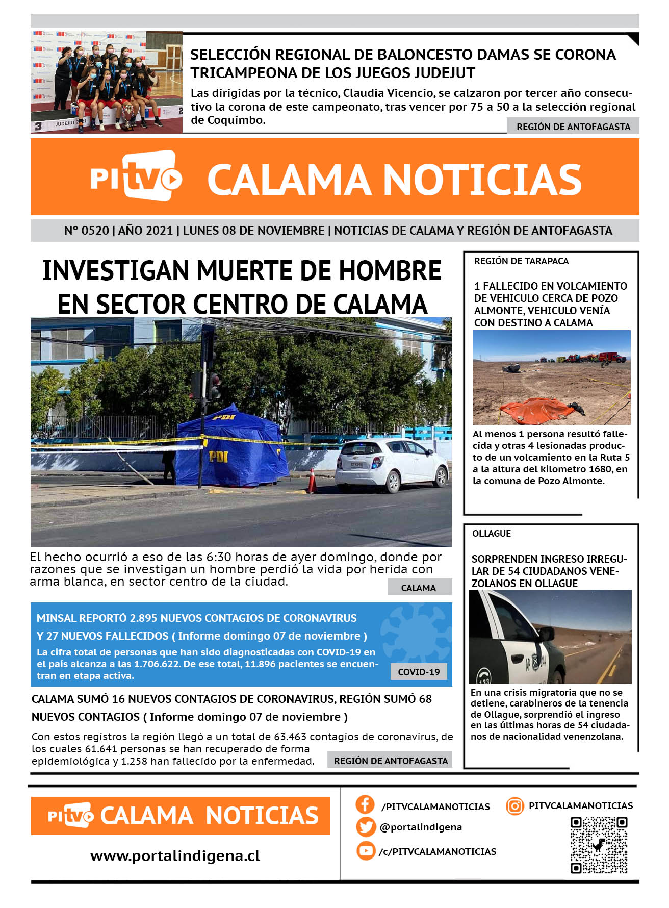 Noticias Portada Nº 520 Lunes 08 de Noviembre de 2021 Por PITV Calama Noticias Lunes 8 Noviembre 2021 | 07:49 Share FacebookTwitterWhatsApp VISITAS 52 Lo más leido Contraloría toma razón de Decreto que obliga a empresas de transporte vincular nombres de pasajeros con equipajes para combatir el “Narco Equipaje” 10 de Julio de 2024 Bienes Nacionales notifica desalojo de inmuebles fiscales ubicados en sector Sur de la extensión Puerto Seco en Calama 9 de Octubre de 2024 Doctora venezolana se mantiene internada en estado crítico en Hospital de Calama: Fue encontrada muy mal herida al interior de su departamento 29 de Septiembre de 2025 Autorizan adelantar las vacaciones de invierno para establecimientos educacionales municipales de Calama 13 de Junio de 2024 PITV Calama Noticiashttps://www.pitvcalamanoticias.cl [ads1] Share FacebookTwitterWhatsApp Previous articleSELECCIÓN REGIONAL DE BALONCESTO DAMAS SE CORONA TRICAMPEONA DE LOS JUEGOS JUDEJUT Next articleFISCALÍA DE CALAMA OBTUVO CONDENA DE 16 AÑOS DE PRESIDIO EFECTIVO PARA AUTOR DE VIOLENTO ROBO CON HOMICIDIO DE GUARDIA También puedes leer Carabineros se reúne y refuerza vínculos estratégicos con dirigentes de “tomas” en Calama 20 de Marzo de 2026 Juanes pondrá el broche de oro en Show Aniversario 147 de Calama 19 de Marzo de 2026 Hospital de Calama habilitó punto transitorio de vacunación contra la Influenza 2026 19 de Marzo de 2026 68 Lo Último Carabineros se reúne y refuerza vínculos estratégicos con dirigentes de “tomas” en Calama 20 de Marzo de 2026 Juanes pondrá el broche de oro en Show Aniversario 147 de Calama 19 de Marzo de 2026