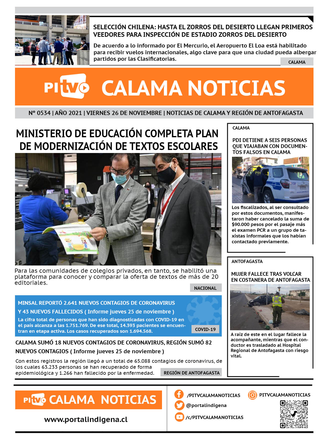 Noticias Portada Nº 534 Viernes 26 de Noviembre de 2021 Por PITV Calama Noticias Viernes 26 Noviembre 2021 | 08:00 Share FacebookTwitterWhatsApp VISITAS 164 Lo más leido Contraloría toma razón de Decreto que obliga a empresas de transporte vincular nombres de pasajeros con equipajes para combatir el “Narco Equipaje” 10 de Julio de 2024 Bienes Nacionales notifica desalojo de inmuebles fiscales ubicados en sector Sur de la extensión Puerto Seco en Calama 9 de Octubre de 2024 Doctora venezolana se mantiene internada en estado crítico en Hospital de Calama: Fue encontrada muy mal herida al interior de su departamento 29 de Septiembre de 2025 Autorizan adelantar las vacaciones de invierno para establecimientos educacionales municipales de Calama 13 de Junio de 2024 PITV Calama Noticiashttps://www.pitvcalamanoticias.cl [ads1] Share FacebookTwitterWhatsApp Previous articleMUJER FALLECE TRAS VOLCAR EN COSTANERA DE ANTOFAGASTANext articleSELECCIÓN CHILENA OPERACIÓN CALAMA: MARTIN LASARTE DT DE LA ROJA CONFIRMA QUE LA SELECCIÓN CHILENA JUGARÁ EN CALAMA CON ARGENTINA También puedes leer Investigan muerte de menor de 5 años en Antofagasta: hay una detenida 17 de Marzo de 2026 PDI despliega fiscalización migratoria masiva en Antofagasta y concreta detenciones por infracciones y expulsión vigente 17 de Marzo de 2026 Carabineros detiene a tres sujetos por tráfico de drogas en Calama 17 de Marzo de 2026 168 Lo Último Investigan muerte de menor de 5 años en Antofagasta: hay una detenida 17 de Marzo de 2026 PDI despliega fiscalización migratoria masiva en Antofagasta y concreta detenciones por infracciones y expulsión vigente 17 de Marzo de 2026