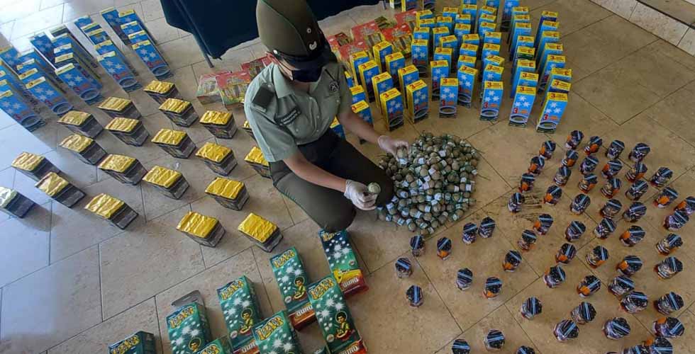 Es en este contexto que al fiscalizar un vehículo, sorprenden el traslado de casi 3 mil unidades de fuegos artificiales de distinto tipo, ante esto IAVG de 28 años, chileno y con antecedentes penales junto a su acompañante LMRM, de 27 años, colombiana sin antecedentes son detenidos y puestos a disposición de la fiscalía local.