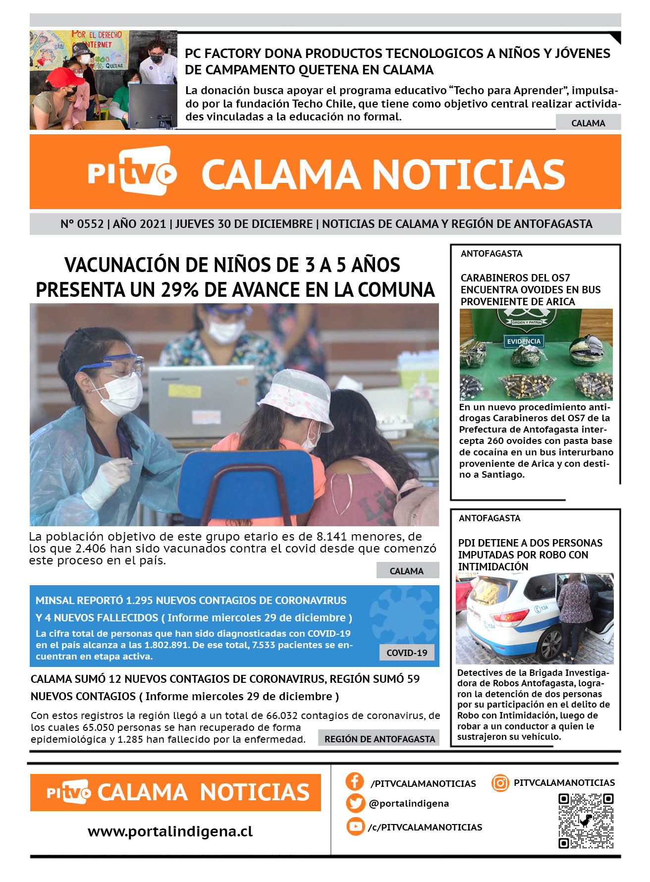 Noticias Portada Nº 552 Jueves 30 de Diciembre de 2021 Por PITV Calama Noticias Jueves 30 Diciembre 2021 | 08:00 Share FacebookTwitterWhatsApp VISITAS 61 Lo más leido Contraloría toma razón de Decreto que obliga a empresas de transporte vincular nombres de pasajeros con equipajes para combatir el “Narco Equipaje” 10 de Julio de 2024 Bienes Nacionales notifica desalojo de inmuebles fiscales ubicados en sector Sur de la extensión Puerto Seco en Calama 9 de Octubre de 2024 Doctora venezolana se mantiene internada en estado crítico en Hospital de Calama: Fue encontrada muy mal herida al interior de su departamento 29 de Septiembre de 2025 Autorizan adelantar las vacaciones de invierno para establecimientos educacionales municipales de Calama 13 de Junio de 2024 PITV Calama Noticiashttps://www.pitvcalamanoticias.cl [ads1] Share FacebookTwitterWhatsApp Previous articleCARABINEROS DEL OS7 ENCUENTRA OVOIDES EN BUS PROVENIENTE DE ARICANext articleMINSAL REPORTÓ 1.813 NUEVOS CONTAGIOS DE CORONAVIRUS Y 33 NUEVOS FALLECIDOS También puedes leer PDI esclarece hallazgo de dedo humano en Calama y descarta delito 18 de Marzo de 2026 Fiscalización migratoria en Calama deja 10 extranjeros denunciados y una persona detenida 18 de Marzo de 2026 Alcalde Eliecer Chamorro fortalece coordinación con el nuevo Delegado Presidencial de El Loa para avanzar en seguridad y desarrollo comunal 18 de Marzo de 2026 129 Lo Último PDI esclarece hallazgo de dedo humano en Calama y descarta delito 18 de Marzo de 2026 Fiscalización migratoria en Calama deja 10 extranjeros denunciados y una persona detenida 18 de Marzo de 2026