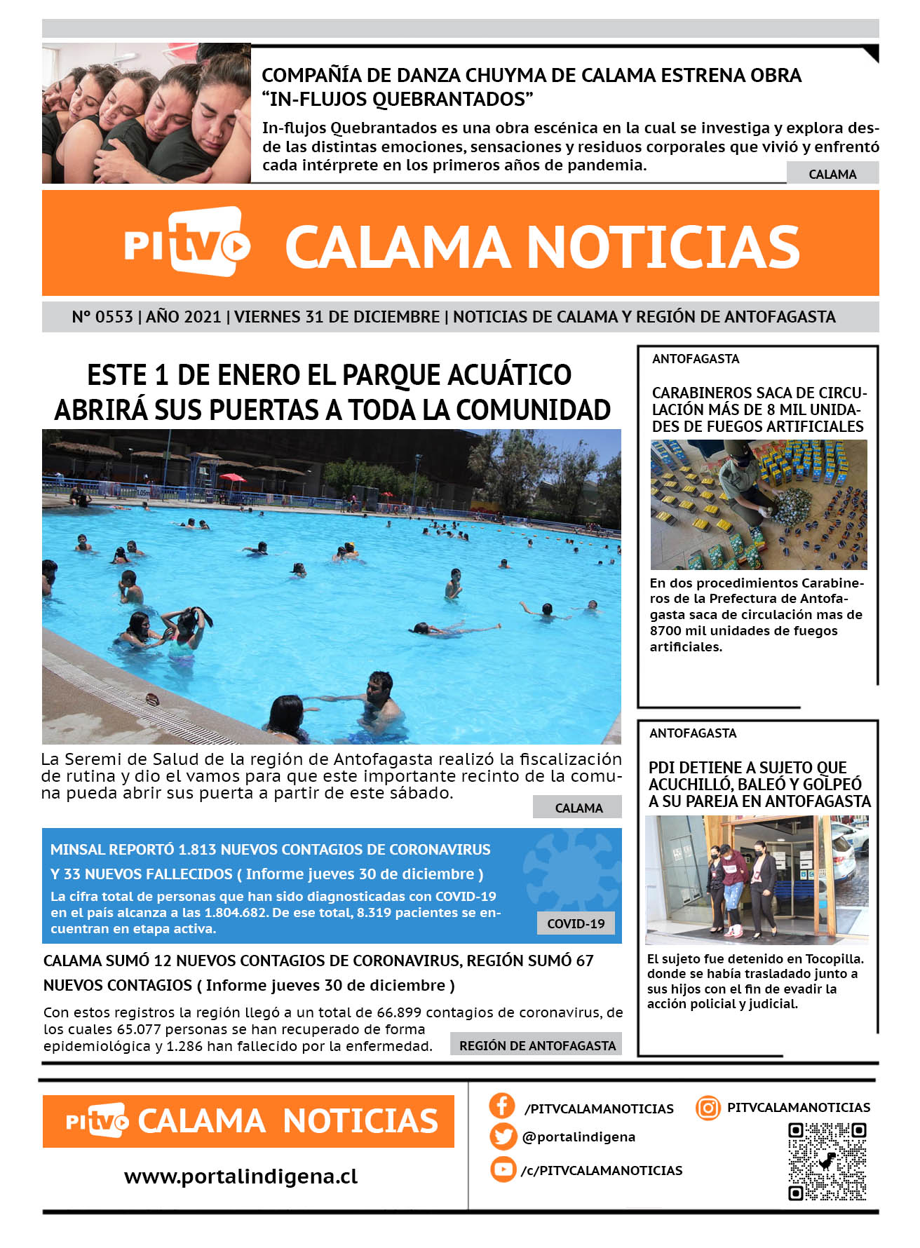 Noticias Portada Nº 553 Viernes 31 de Diciembre de 2021 Por PITV Calama Noticias Viernes 31 Diciembre 2021 | 08:00 Share FacebookTwitterWhatsApp VISITAS 98 Lo más leido Contraloría toma razón de Decreto que obliga a empresas de transporte vincular nombres de pasajeros con equipajes para combatir el “Narco Equipaje” 10 de Julio de 2024 Bienes Nacionales notifica desalojo de inmuebles fiscales ubicados en sector Sur de la extensión Puerto Seco en Calama 9 de Octubre de 2024 Doctora venezolana se mantiene internada en estado crítico en Hospital de Calama: Fue encontrada muy mal herida al interior de su departamento 29 de Septiembre de 2025 Autorizan adelantar las vacaciones de invierno para establecimientos educacionales municipales de Calama 13 de Junio de 2024 PITV Calama Noticiashttps://www.pitvcalamanoticias.cl [ads1] Share FacebookTwitterWhatsApp Previous articlePDI DETIENE A SUJETO QUE ACUCHILLÓ, BALEÓ Y GOLPEÓ A SU PAREJA EN ANTOFAGASTANext articleINVESTIGAN MUERTE DE HOMBRE EXTRANJERO EN LA CIUDAD DE CALAMA También puedes leer Hospital de Calama habilitó punto transitorio de vacunación contra la Influenza 2026 19 de Marzo de 2026 1 fallecido tras volcamiento en camino a Socaire (ruta 23ch) 19 de Marzo de 2026 Minera El Abra, filial de Freeport-McMoRan ingresa Proyecto de Continuidad Operacional para evaluación ambiental 19 de Marzo de 2026 167 Lo Último Hospital de Calama habilitó punto transitorio de vacunación contra la Influenza 2026 19 de Marzo de 2026 1 fallecido tras volcamiento en camino a Socaire (ruta 23ch) 19 de Marzo de 2026