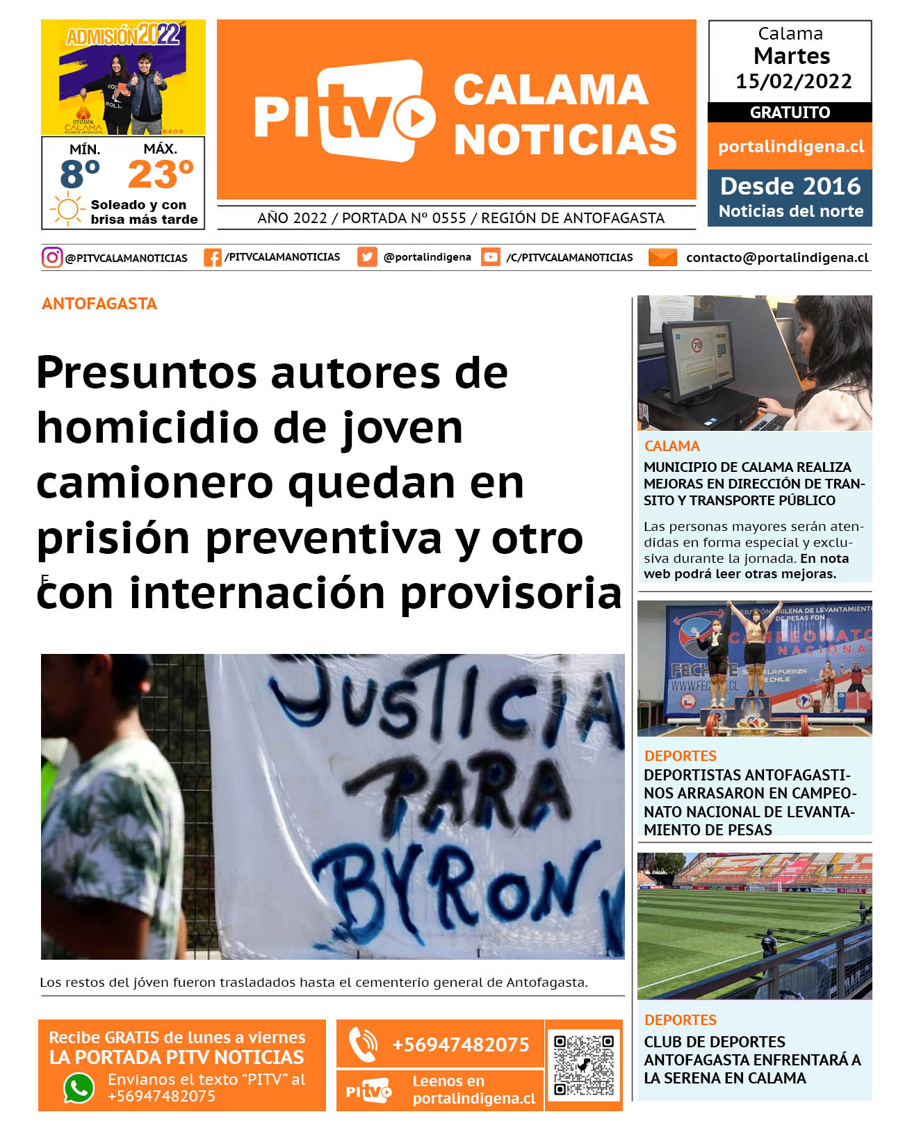 Noticias Portada Nº 555 Martes 15 de Febrero de 2022 Por PITV Calama Noticias Martes 15 Febrero 2022 | 08:00 Share FacebookTwitterWhatsApp VISITAS 79 Lo más leido Contraloría toma razón de Decreto que obliga a empresas de transporte vincular nombres de pasajeros con equipajes para combatir el “Narco Equipaje” 10 de Julio de 2024 Bienes Nacionales notifica desalojo de inmuebles fiscales ubicados en sector Sur de la extensión Puerto Seco en Calama 9 de Octubre de 2024 Doctora venezolana se mantiene internada en estado crítico en Hospital de Calama: Fue encontrada muy mal herida al interior de su departamento 29 de Septiembre de 2025 Autorizan adelantar las vacaciones de invierno para establecimientos educacionales municipales de Calama 13 de Junio de 2024 PITV Calama Noticiashttps://www.pitvcalamanoticias.cl [ads3] Share FacebookTwitterWhatsApp Previous articleMUNICIPIO DE CALAMA REALIZA MEJORAS EN DIRECCIÓN DE TRANSITO Y TRANSPORTE PÚBLICONext articleVOLUNTARIADO “EL ABRA EN ACCIÓN” ENTREGÓ NUEVA INDUMENTARIA A JÓVENES DEPORTISTAS DE CALAMA También puedes leer PDI esclarece hallazgo de dedo humano en Calama y descarta delito 18 de Marzo de 2026 Fiscalización migratoria en Calama deja 10 extranjeros denunciados y una persona detenida 18 de Marzo de 2026 Alcalde Eliecer Chamorro fortalece coordinación con el nuevo Delegado Presidencial de El Loa para avanzar en seguridad y desarrollo comunal 18 de Marzo de 2026 127 Lo Último PDI esclarece hallazgo de dedo humano en Calama y descarta delito 18 de Marzo de 2026 Fiscalización migratoria en Calama deja 10 extranjeros denunciados y una persona detenida 18 de Marzo de 2026