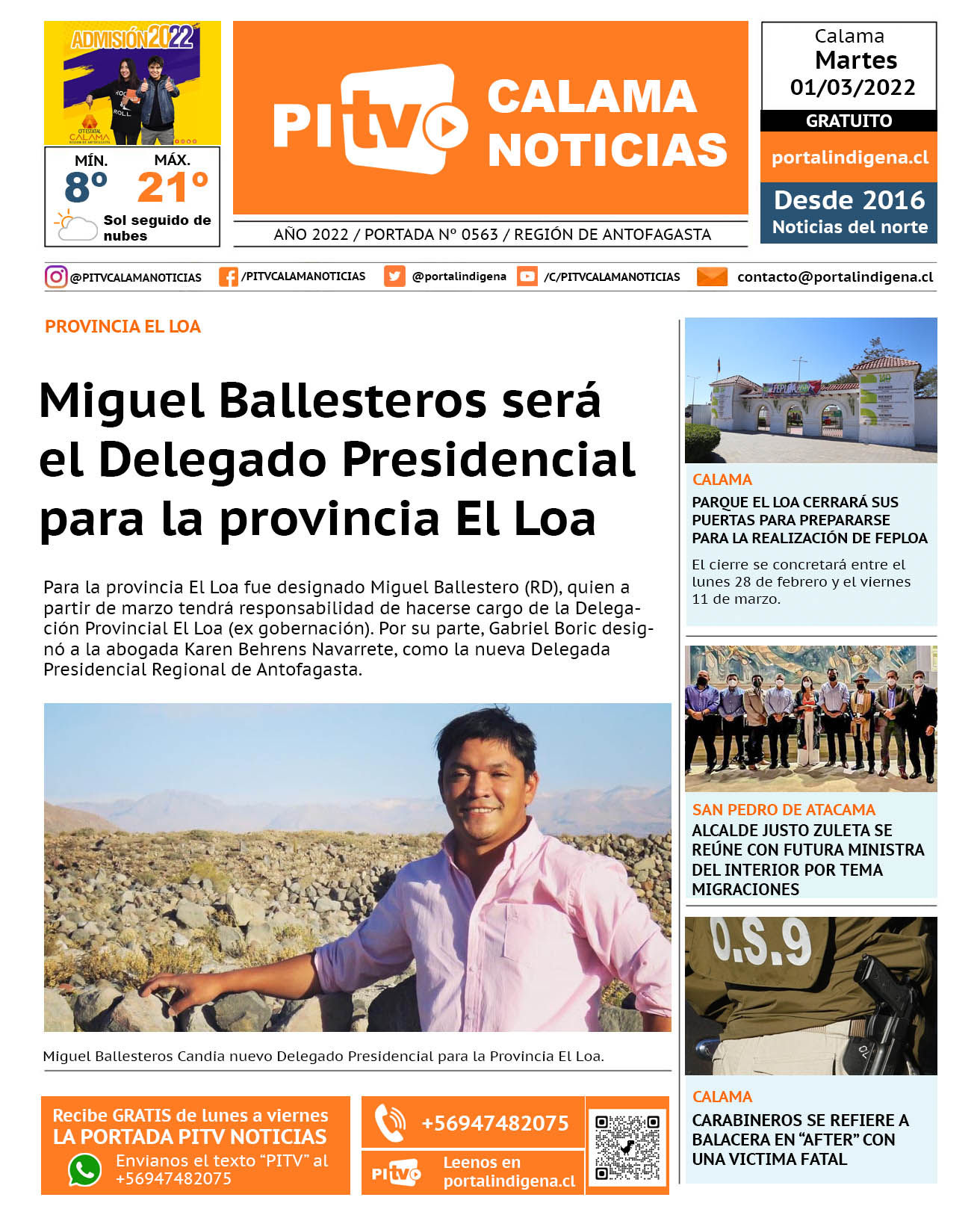 Noticias Portada Nº 563 Martes 01 de Marzo de 2022 Por PITV Calama Noticias Martes 1 Marzo 2022 | 08:00 Share FacebookTwitterWhatsApp VISITAS 126 Lo más leido Contraloría toma razón de Decreto que obliga a empresas de transporte vincular nombres de pasajeros con equipajes para combatir el “Narco Equipaje” 10 de Julio de 2024 Bienes Nacionales notifica desalojo de inmuebles fiscales ubicados en sector Sur de la extensión Puerto Seco en Calama 9 de Octubre de 2024 Doctora venezolana se mantiene internada en estado crítico en Hospital de Calama: Fue encontrada muy mal herida al interior de su departamento 29 de Septiembre de 2025 Autorizan adelantar las vacaciones de invierno para establecimientos educacionales municipales de Calama 13 de Junio de 2024 PITV Calama Noticiashttps://www.pitvcalamanoticias.cl [ads1] Share FacebookTwitterWhatsApp Previous articlePARQUE EL LOA CERRARÁ SUS PUERTAS PARA PREPARARSE PARA LA REALIZACIÓN DE FEPLOANext articleARTISTAS NACIONALES Y LOCALES DE TOCOPILLA RESCATAN CON MURALES SU PATRIMONIO BARRIAL CON FONDO PATRIMONIAL DE EL ABRA También puedes leer Investigan muerte de menor de 5 años en Antofagasta: hay una detenida 17 de Marzo de 2026 PDI despliega fiscalización migratoria masiva en Antofagasta y concreta detenciones por infracciones y expulsión vigente 17 de Marzo de 2026 Carabineros detiene a tres sujetos por tráfico de drogas en Calama 17 de Marzo de 2026 259 Lo Último Investigan muerte de menor de 5 años en Antofagasta: hay una detenida 17 de Marzo de 2026 PDI despliega fiscalización migratoria masiva en Antofagasta y concreta detenciones por infracciones y expulsión vigente 17 de Marzo de 2026