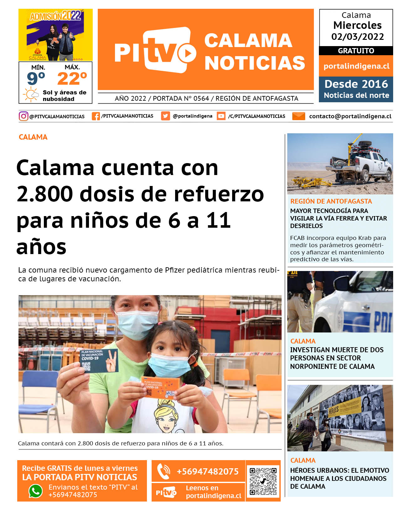Noticias Portada Nº 564 Miercoles 02 de Marzo de 2022 Por PITV Calama Noticias Miércoles 2 Marzo 2022 | 07:47 Share FacebookTwitterWhatsApp VISITAS 90 Lo más leido Contraloría toma razón de Decreto que obliga a empresas de transporte vincular nombres de pasajeros con equipajes para combatir el “Narco Equipaje” 10 de Julio de 2024 Bienes Nacionales notifica desalojo de inmuebles fiscales ubicados en sector Sur de la extensión Puerto Seco en Calama 9 de Octubre de 2024 Doctora venezolana se mantiene internada en estado crítico en Hospital de Calama: Fue encontrada muy mal herida al interior de su departamento 29 de Septiembre de 2025 Autorizan adelantar las vacaciones de invierno para establecimientos educacionales municipales de Calama 13 de Junio de 2024 PITV Calama Noticiashttps://www.pitvcalamanoticias.cl [ads1] Share FacebookTwitterWhatsApp Previous articleCALAMA CUENTA CON 2.800 DOSIS DE REFUERZO PARA NIÑOS DE 6 A 11 AÑOS Next articlePRESIDENTE SEBASTIAN PIÑERA EXTIENDE ESTADO DE EXCEPCIÓN PARA INTERIOR DE LA PROVINCIA EL LOA También puedes leer Absuelven a Cristian Insaurralde de segunda tarjeta amarilla que recibió contra Iquique 18 de Marzo de 2026 Cerco al narcotráfico permite incautación de 1.348 kilos de drogas en dos procedimientos 18 de Marzo de 2026 Investigan muerte de menor de 5 años en Antofagasta: hay una detenida 17 de Marzo de 2026 145 Lo Último Amplían detención de principal sospechosa de homicidio de menor en Antofagasta 18 de Marzo de 2026 Absuelven a Cristian Insaurralde de segunda tarjeta amarilla que recibió contra Iquique 18 de Marzo de 2026