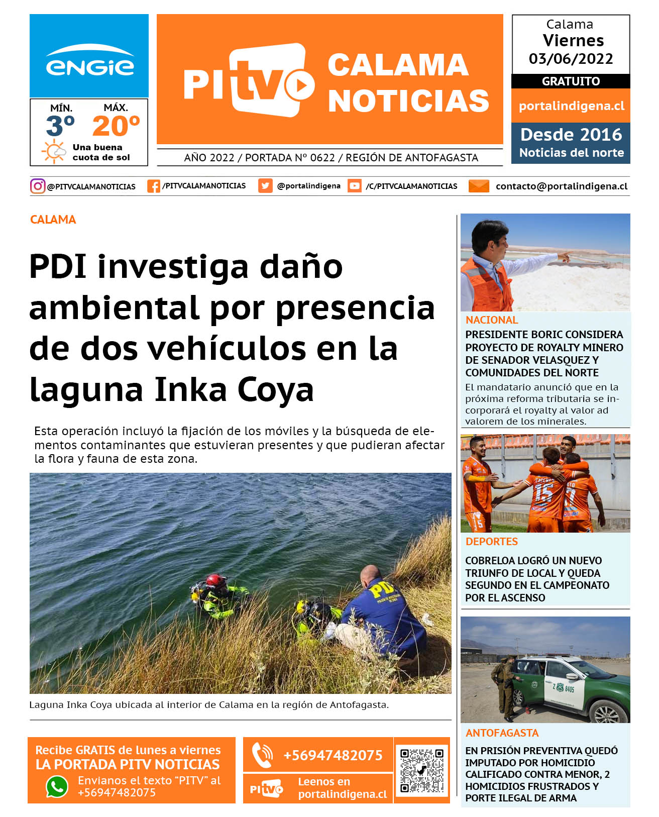 Noticias Portada Nº 622 Viernes 03 de Junio de 2022 Por PITV Calama Noticias Viernes 3 Junio 2022 | 08:00 Share FacebookTwitterWhatsApp VISITAS 89 Lo más leido Contraloría toma razón de Decreto que obliga a empresas de transporte vincular nombres de pasajeros con equipajes para combatir el “Narco Equipaje” 10 de Julio de 2024 Bienes Nacionales notifica desalojo de inmuebles fiscales ubicados en sector Sur de la extensión Puerto Seco en Calama 9 de Octubre de 2024 Doctora venezolana se mantiene internada en estado crítico en Hospital de Calama: Fue encontrada muy mal herida al interior de su departamento 29 de Septiembre de 2025 Autorizan adelantar las vacaciones de invierno para establecimientos educacionales municipales de Calama 13 de Junio de 2024 PITV Calama Noticiashttps://www.pitvcalamanoticias.cl [ads7] Share FacebookTwitterWhatsApp Previous articlePDI INVESTIGA DAÑO AMBIENTAL POR PRESENCIA DE DOS VEHÍCULOS EN LA LAGUNA INKA COYANext articleLA PRIMERA FIESTA COSTUMBRISTA SE REALIZARÁ ESTE SABADO 04 DE JUNIO EN OLLAGÜE También puedes leer Juanes pondrá el broche de oro en Show Aniversario 147 de Calama 19 de Marzo de 2026 Hospital de Calama habilitó punto transitorio de vacunación contra la Influenza 2026 19 de Marzo de 2026 1 fallecido tras volcamiento en camino a Socaire (ruta 23ch) 19 de Marzo de 2026 125 Lo Último Juanes pondrá el broche de oro en Show Aniversario 147 de Calama 19 de Marzo de 2026 Hospital de Calama habilitó punto transitorio de vacunación contra la Influenza 2026 19 de Marzo de 2026