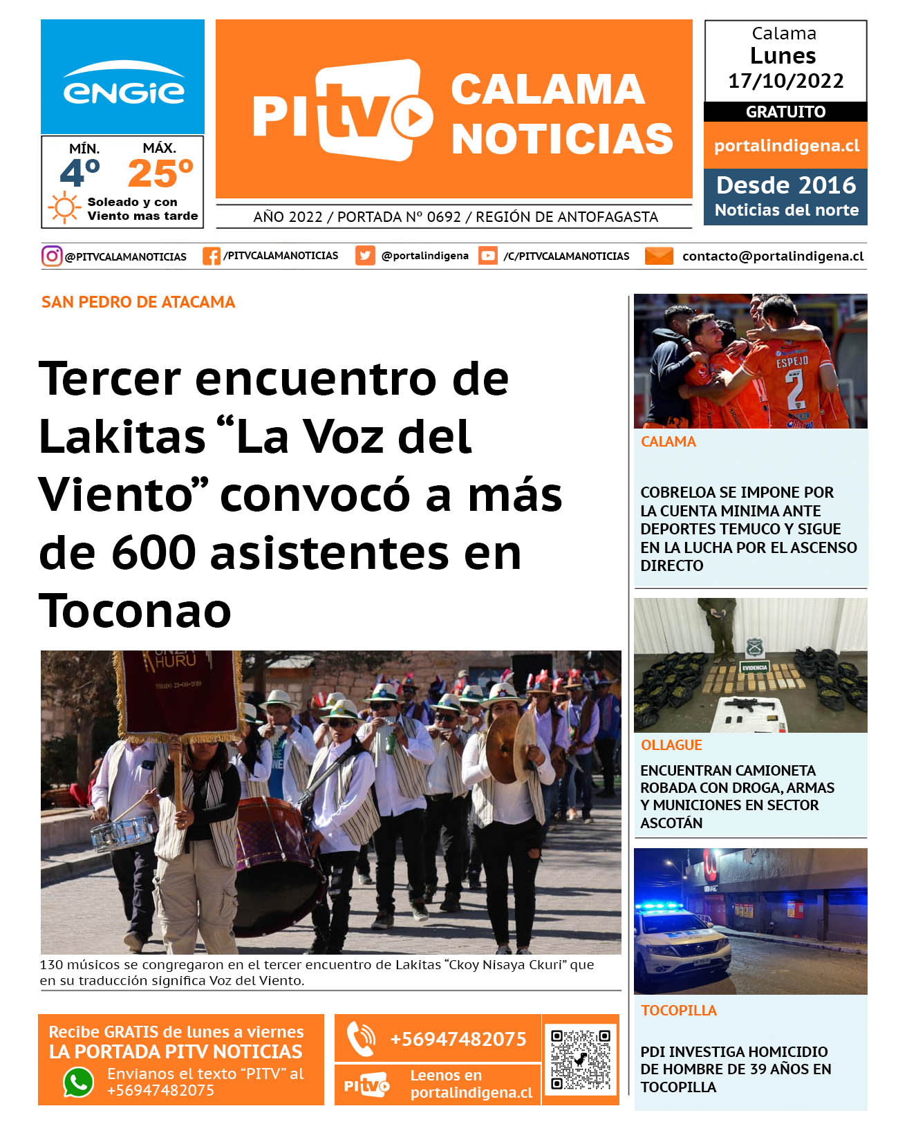 Noticias Portada Nº 692 Lunes 17 de Octubre de 2022 Por PITV Calama Noticias Lunes 17 Octubre 2022 | 07:27 Share FacebookTwitterWhatsApp VISITAS 91 Lo más leido Contraloría toma razón de Decreto que obliga a empresas de transporte vincular nombres de pasajeros con equipajes para combatir el “Narco Equipaje” 10 de Julio de 2024 Bienes Nacionales notifica desalojo de inmuebles fiscales ubicados en sector Sur de la extensión Puerto Seco en Calama 9 de Octubre de 2024 Doctora venezolana se mantiene internada en estado crítico en Hospital de Calama: Fue encontrada muy mal herida al interior de su departamento 29 de Septiembre de 2025 Autorizan adelantar las vacaciones de invierno para establecimientos educacionales municipales de Calama 13 de Junio de 2024 PITV Calama Noticiashttps://www.pitvcalamanoticias.cl [ads7] Share FacebookTwitterWhatsApp Previous articlePDI INVESTIGA HOMICIDIO DE HOMBRE DE 39 AÑOS EN TOCOPILLANext articleNUEVO ROBO AFECTA A JARDIN INFANTIL NIDITO DE ANGELES EN CALAMA También puedes leer Absuelven a Cristian Insaurralde de segunda tarjeta amarilla que recibió contra Iquique 18 de Marzo de 2026 Cerco al narcotráfico permite incautación de 1.348 kilos de drogas en dos procedimientos 18 de Marzo de 2026 Investigan muerte de menor de 5 años en Antofagasta: hay una detenida 17 de Marzo de 2026 113 Lo Último Amplían detención de principal sospechosa de homicidio de menor en Antofagasta 18 de Marzo de 2026 Absuelven a Cristian Insaurralde de segunda tarjeta amarilla que recibió contra Iquique 18 de Marzo de 2026