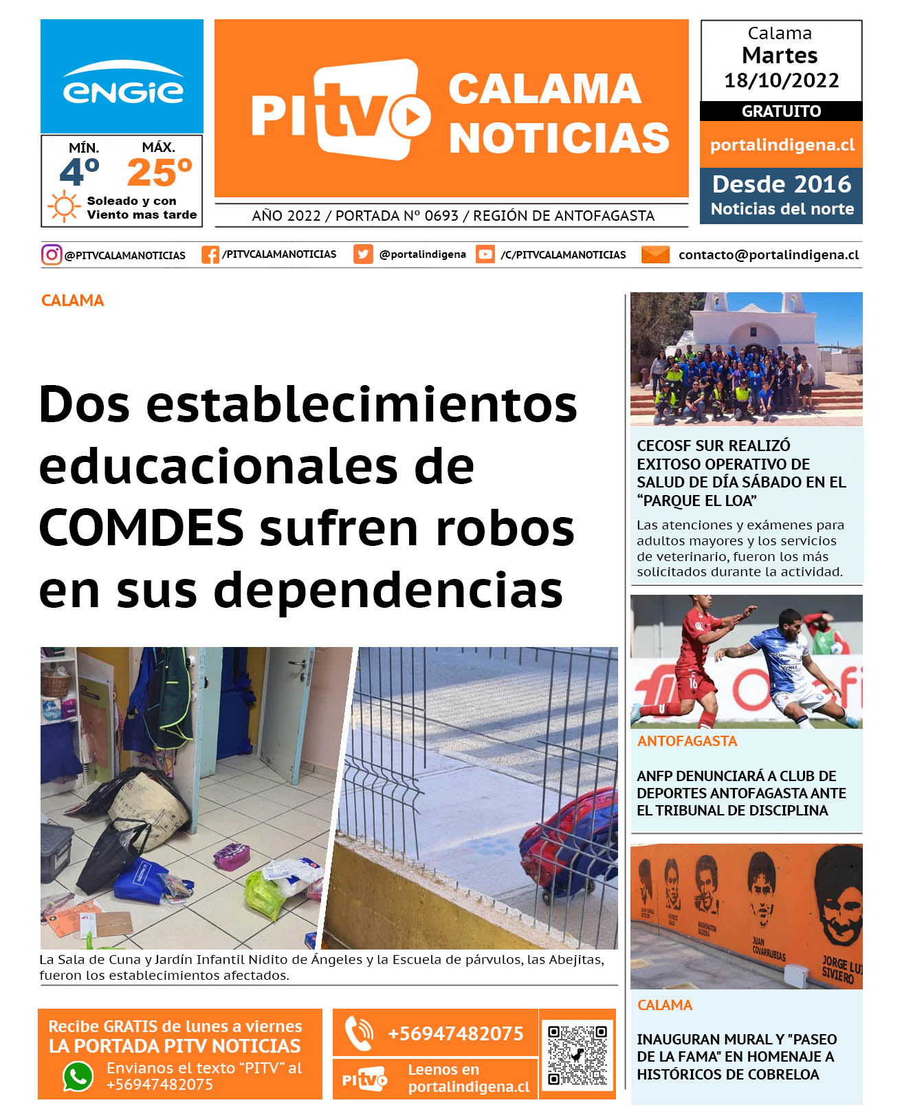 Noticias Portada Nº 693 Martes 18 de Octubre de 2022 Por PITV Calama Noticias Martes 18 Octubre 2022 | 07:53 Share FacebookTwitterWhatsApp VISITAS 65 Lo más leido Contraloría toma razón de Decreto que obliga a empresas de transporte vincular nombres de pasajeros con equipajes para combatir el “Narco Equipaje” 10 de Julio de 2024 Bienes Nacionales notifica desalojo de inmuebles fiscales ubicados en sector Sur de la extensión Puerto Seco en Calama 9 de Octubre de 2024 Doctora venezolana se mantiene internada en estado crítico en Hospital de Calama: Fue encontrada muy mal herida al interior de su departamento 29 de Septiembre de 2025 Autorizan adelantar las vacaciones de invierno para establecimientos educacionales municipales de Calama 13 de Junio de 2024 PITV Calama Noticiashttps://www.pitvcalamanoticias.cl [ads7] Share FacebookTwitterWhatsApp Previous articleCECOSF SUR REALIZÓ EXITOSO OPERATIVO DE SALUD DE DÍA SÁBADO EN EL “PARQUE EL LOA”Next articleCON OBRA LOCAL Y TEATRO LLENO INICIÓ FENTIC 2022 También puedes leer Investigan muerte de menor de 5 años en Antofagasta: hay una detenida 17 de Marzo de 2026 PDI despliega fiscalización migratoria masiva en Antofagasta y concreta detenciones por infracciones y expulsión vigente 17 de Marzo de 2026 Carabineros detiene a tres sujetos por tráfico de drogas en Calama 17 de Marzo de 2026 91 Lo Último Investigan muerte de menor de 5 años en Antofagasta: hay una detenida 17 de Marzo de 2026 PDI despliega fiscalización migratoria masiva en Antofagasta y concreta detenciones por infracciones y expulsión vigente 17 de Marzo de 2026