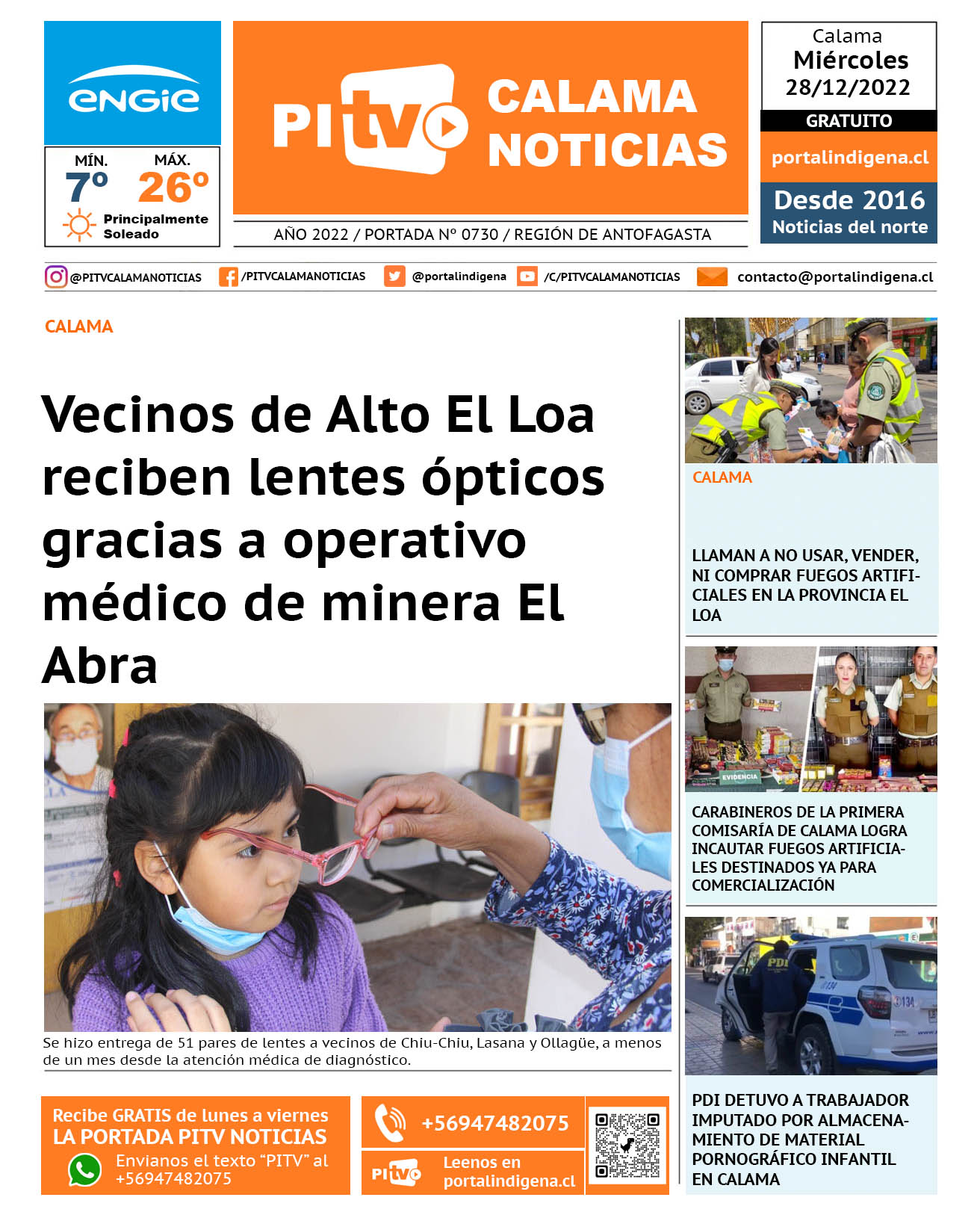 Noticias Portada Nº 730 Miércoles 28 de Diciembre de 2022 Por PITV Calama Noticias Miércoles 28 Diciembre 2022 | 08:00 Share FacebookTwitterWhatsApp VISITAS 226 Lo más leido Contraloría toma razón de Decreto que obliga a empresas de transporte vincular nombres de pasajeros con equipajes para combatir el “Narco Equipaje” 10 de Julio de 2024 Bienes Nacionales notifica desalojo de inmuebles fiscales ubicados en sector Sur de la extensión Puerto Seco en Calama 9 de Octubre de 2024 Doctora venezolana se mantiene internada en estado crítico en Hospital de Calama: Fue encontrada muy mal herida al interior de su departamento 29 de Septiembre de 2025 Autorizan adelantar las vacaciones de invierno para establecimientos educacionales municipales de Calama 13 de Junio de 2024 PITV Calama Noticiashttps://www.pitvcalamanoticias.cl [ads7] Share FacebookTwitterWhatsApp Previous articleLLAMAN A NO USAR, VENDER, NI COMPRAR FUEGOS ARTIFICIALES EN LA PROVINCIA EL LOANext articleREALIZAN CHAPUZON REFRESCANTE CON LAS PERSONAS MAYORES EN PARQUE ACUÁTICO También puedes leer Absuelven a Cristian Insaurralde de segunda tarjeta amarilla que recibió contra Iquique 18 de Marzo de 2026 Cerco al narcotráfico permite incautación de 1.348 kilos de drogas en dos procedimientos 18 de Marzo de 2026 Investigan muerte de menor de 5 años en Antofagasta: hay una detenida 17 de Marzo de 2026 134 Lo Último Amplían detención de principal sospechosa de homicidio de menor en Antofagasta 18 de Marzo de 2026 Absuelven a Cristian Insaurralde de segunda tarjeta amarilla que recibió contra Iquique 18 de Marzo de 2026