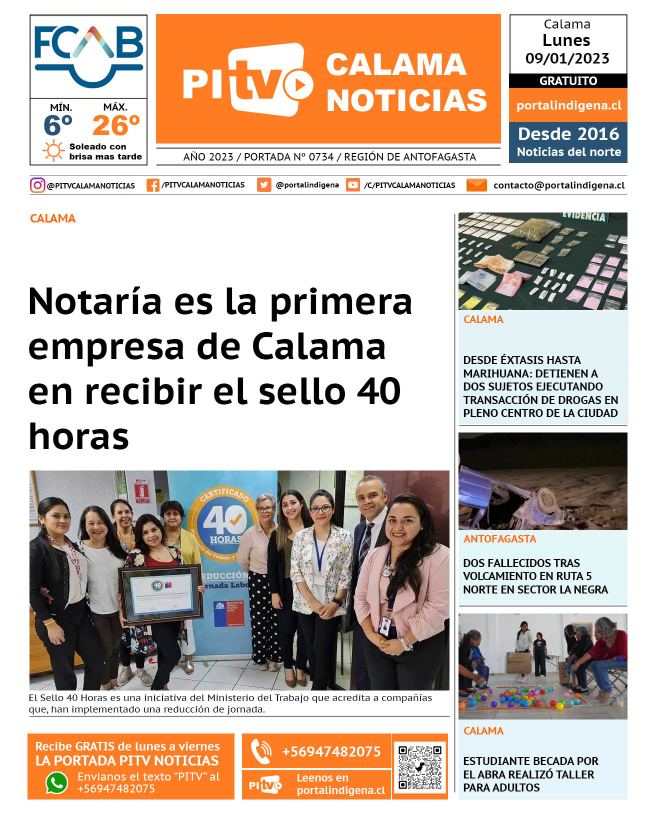 Noticias Portada Nº 734 Lunes 09 de Enero de 2023 Por PITV Calama Noticias Lunes 9 Enero 2023 | 08:00 Share FacebookTwitterWhatsApp VISITAS 164 Lo más leido Contraloría toma razón de Decreto que obliga a empresas de transporte vincular nombres de pasajeros con equipajes para combatir el “Narco Equipaje” 10 de Julio de 2024 Bienes Nacionales notifica desalojo de inmuebles fiscales ubicados en sector Sur de la extensión Puerto Seco en Calama 9 de Octubre de 2024 Doctora venezolana se mantiene internada en estado crítico en Hospital de Calama: Fue encontrada muy mal herida al interior de su departamento 29 de Septiembre de 2025 Autorizan adelantar las vacaciones de invierno para establecimientos educacionales municipales de Calama 13 de Junio de 2024 PITV Calama Noticiashttps://www.pitvcalamanoticias.cl Share FacebookTwitterWhatsApp Previous articleNOTARÍA ES LA PRIMERA EMPRESA DE CALAMA EN RECIBIR EL SELLO 40 HORASNext articleNICOLAS MATURANA DENUNCIÓ AMENAZAS POR PARTE DE HINCHAS DE COBRELOA También puedes leer Cerco al narcotráfico permite incautación de 1.348 kilos de drogas en dos procedimientos 18 de Marzo de 2026 Investigan muerte de menor de 5 años en Antofagasta: hay una detenida 17 de Marzo de 2026 PDI despliega fiscalización migratoria masiva en Antofagasta y concreta detenciones por infracciones y expulsión vigente 17 de Marzo de 2026 143 Lo Último Cerco al narcotráfico permite incautación de 1.348 kilos de drogas en dos procedimientos 18 de Marzo de 2026 Investigan muerte de menor de 5 años en Antofagasta: hay una detenida 17 de Marzo de 2026