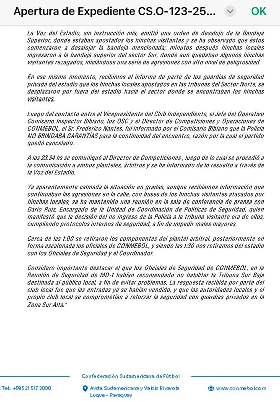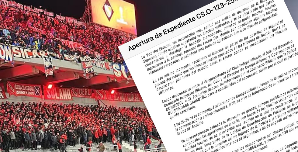 En su informe, el delegado de Conmebol advierte que se solicitó que la tribuna donde hinchas de Independiente quedaron bajo la parcialidad de Universidad de Chile no fuera habilitada para el encuentro, situación que no fue considerada por el club organizador. Ante eso, se refuerza la idea de que Conmebol sí tomó medidas aunque desde el ente organizador las ignoraron, por lo cual el castigo al que se exponen puede ser definitivamente grave.